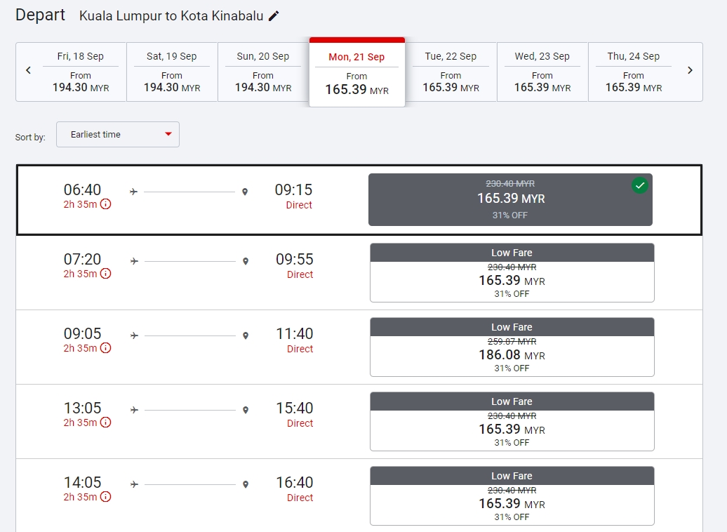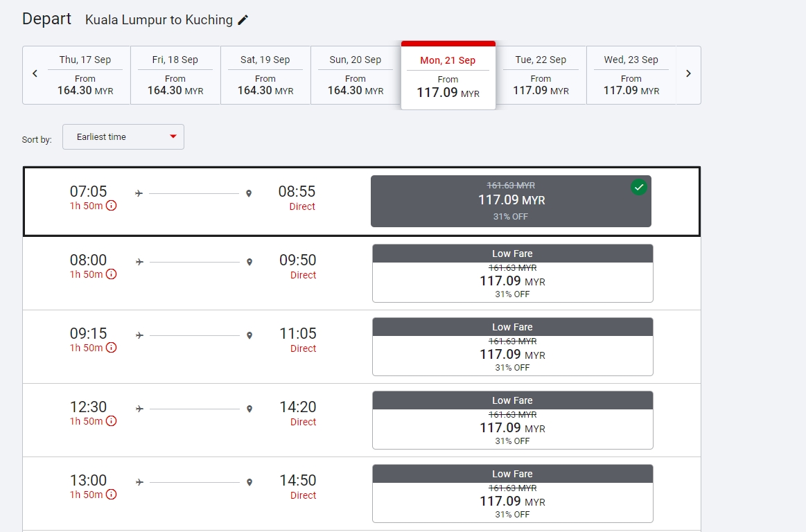 我们在亚航官网快速查询后,发现从吉隆坡飞往亚庇的单程机票价格为165令吉39仙;从吉隆坡飞往古晋的单程机票价格为117令吉9仙,这个票价不包括税费及add-ons费用。
