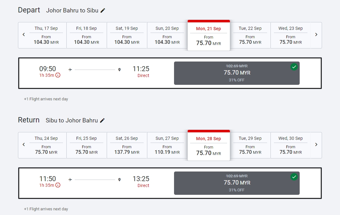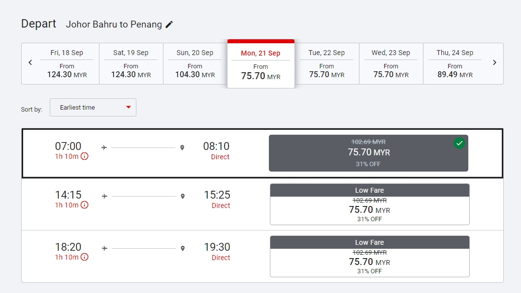 另外,从新山飞往槟城或从新山飞往诗巫的单程机票价格为75令吉70仙,不包括税费及add-ons费用。
