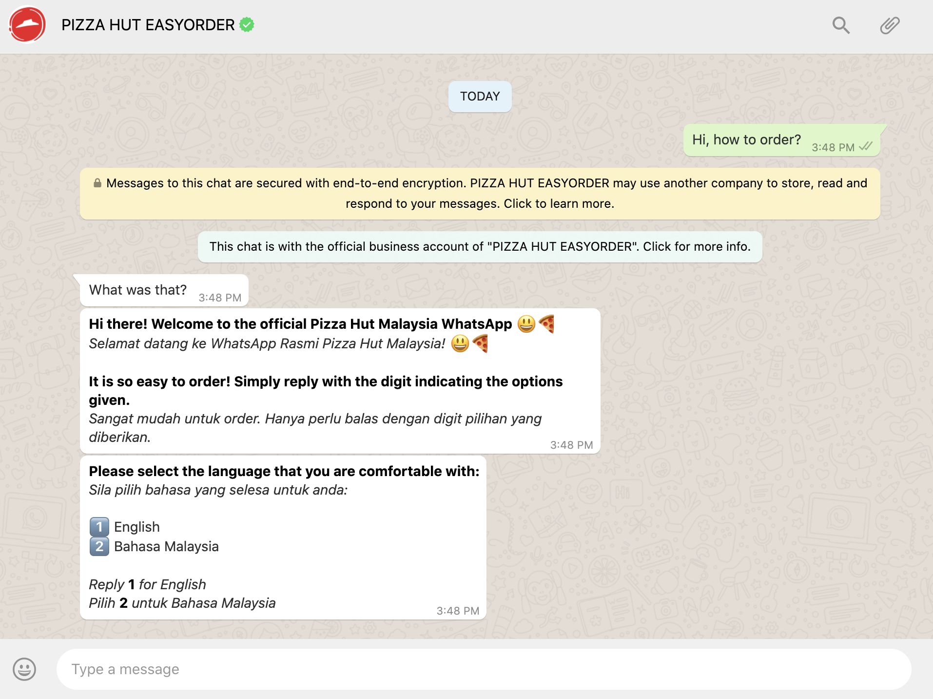 - 首先,顾客向必胜客发送讯息,必胜客也准备好讯息样本:“Pizza sedap 50% off sekarang. Get me one now.”,实际上这只是人工智能客服的回复,讯息内容不重要。