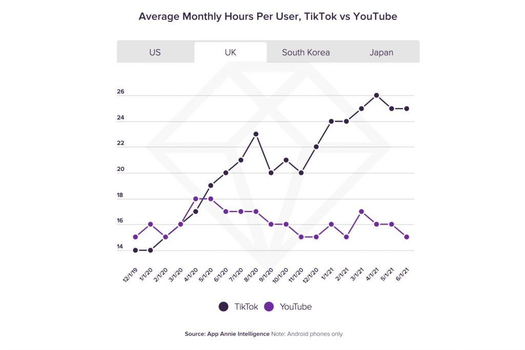 而英国人每月观看TikTok的时间高达25小时,以及只花15小时在YouTube观看影片。