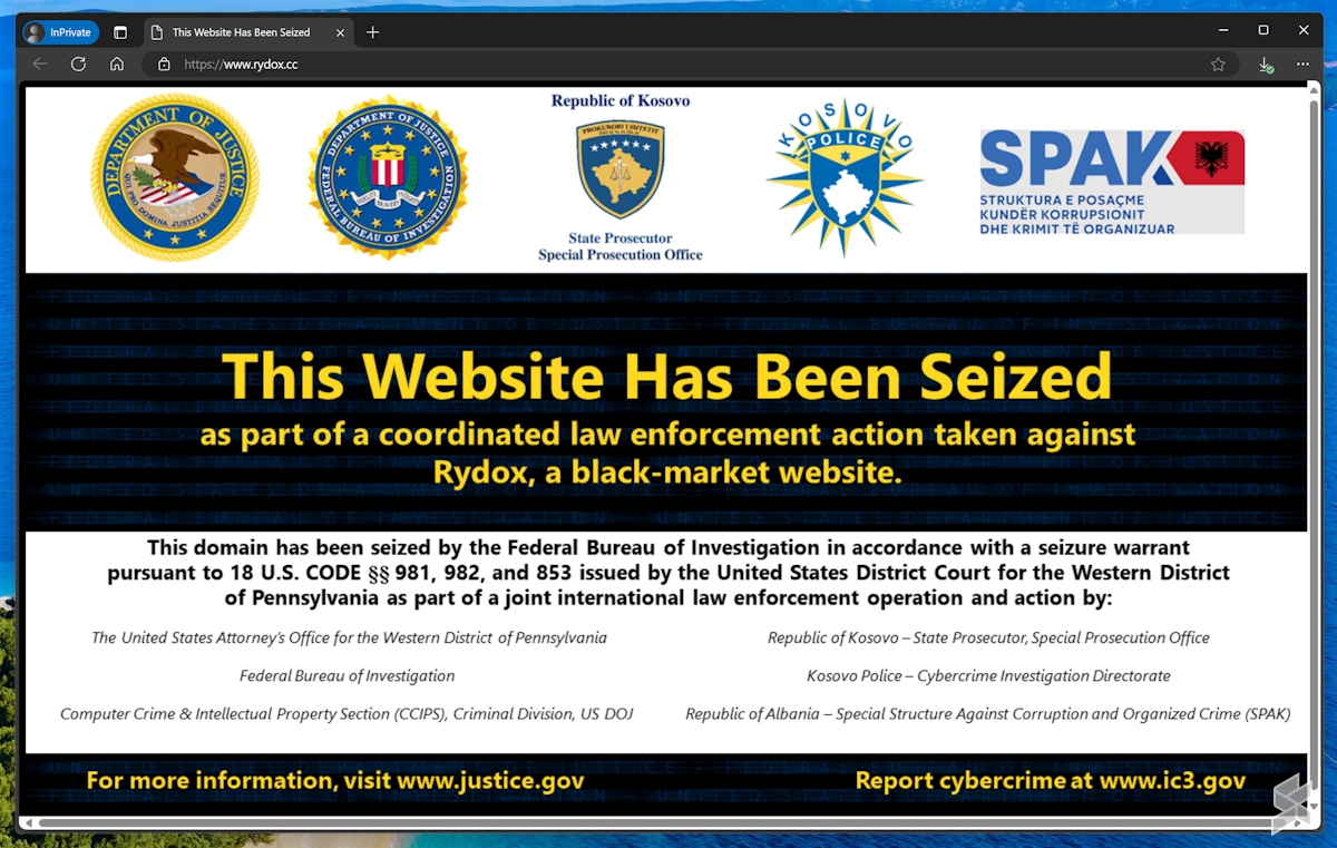 一个名为Rydox的黑市网站通过多国执法机构的联合行动被下线。据美国司法部(DOJ)宣布,该市场的服务器位于吉隆坡。