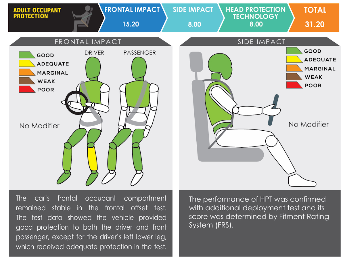 该评估涵盖四个方面的评分,包括总分 40.00 的成人乘员保护(AOP)。另外三个方面为儿童乘员保护(COP)、安全辅助系统(SA)和摩托骑士安全(MS),各占 20.00 分。