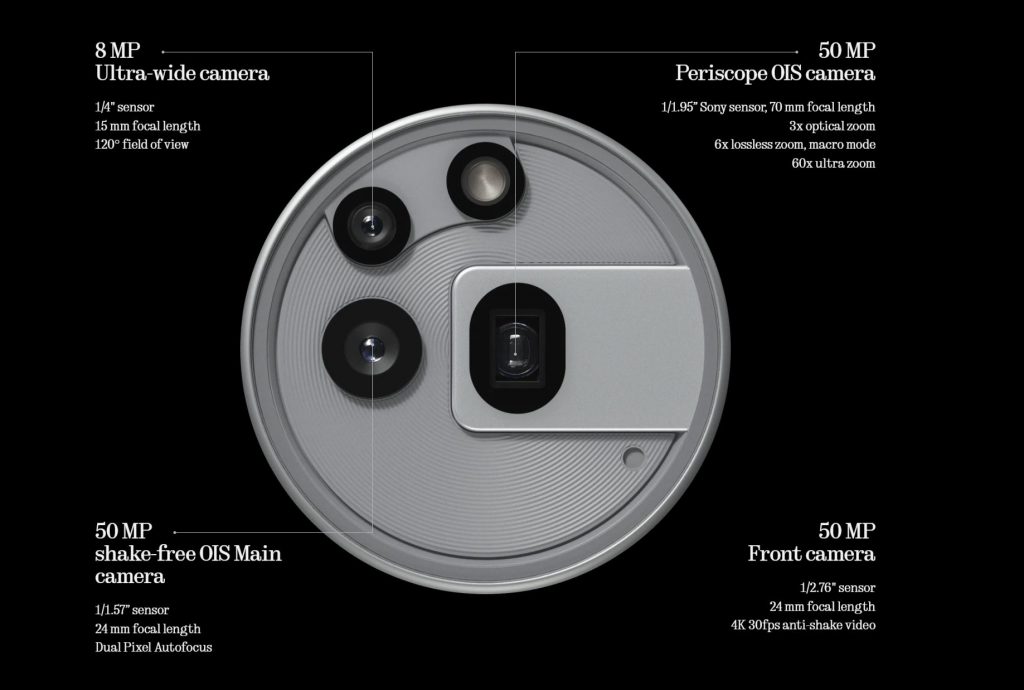 至于 Pro版本,它的50MP主镜头配备了1/1.57英寸传感器和OIS,8MP超广角镜头配备1/4英寸传感器。不过,最突出的功能是配备OIS的50MP潜望镜长焦镜头,它使用更大的1/1.95英寸索尼传感器。长焦镜头支持3倍光学变焦(6倍无损变焦),最高可实现60倍超级变焦。此外,Nothing Phone (3a) Pro的自拍功能也更好,配备了分辨率更高的50MP前置镜头。