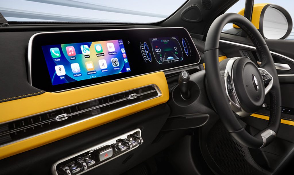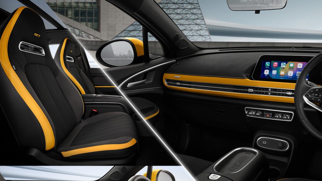 这款紧凑型电动掀背车的内饰还配备了一对运动型座椅,分别供驾驶员和前排乘客使用,头枕上印有GT标志。GT版车型延续了Pro版和Ultra版车型的双色内饰,但颜色组合为黑黄相间。