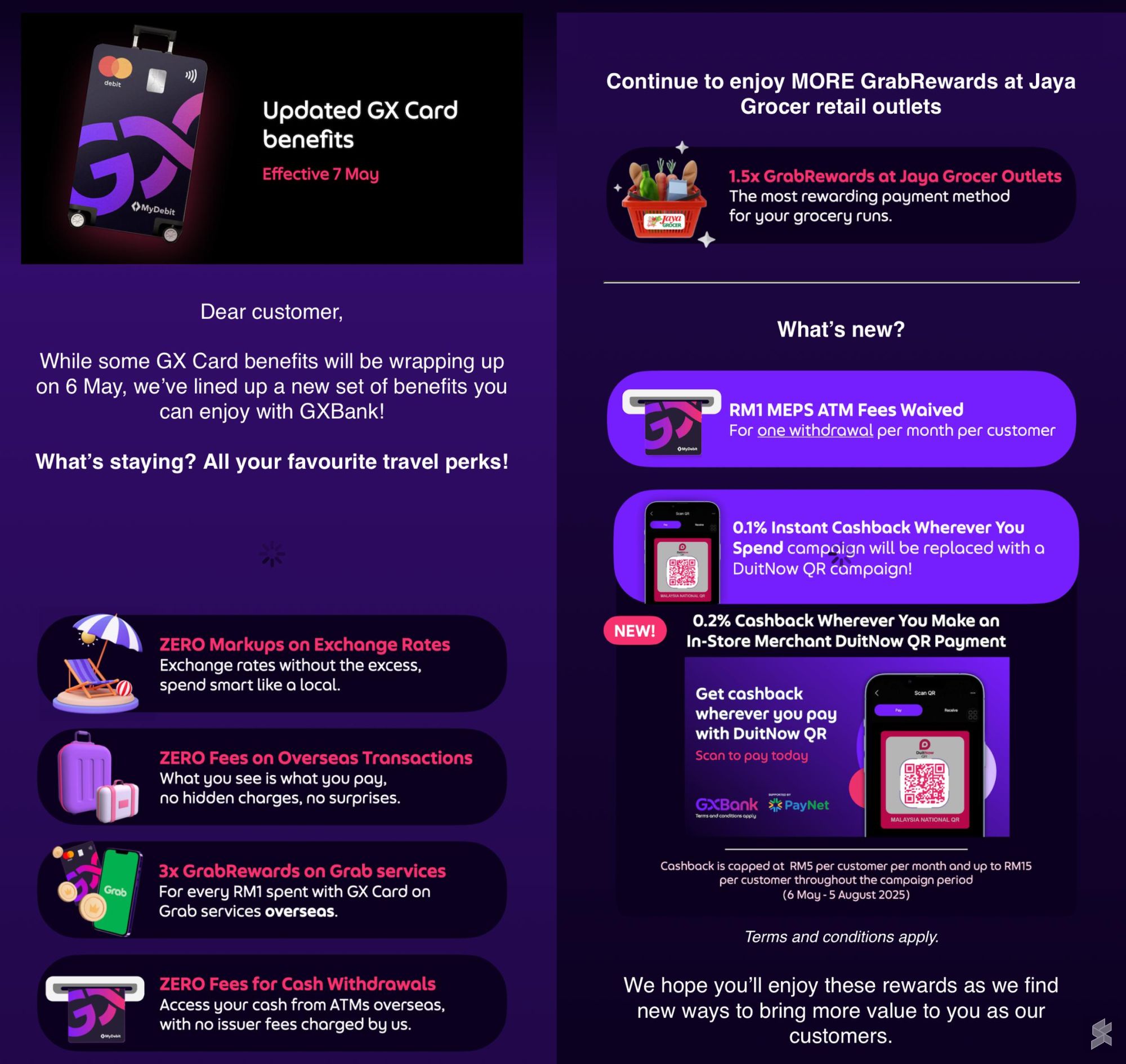 数码银行GXBank公布了其修订后的GX卡(GX Card)及现金返还优惠,将于2025年5月7日起生效。与此同时,其现有的GX卡奖励计划(海外交易现金返还1%,本地交易现金返还0.1%)将于2025年5月6日结束。