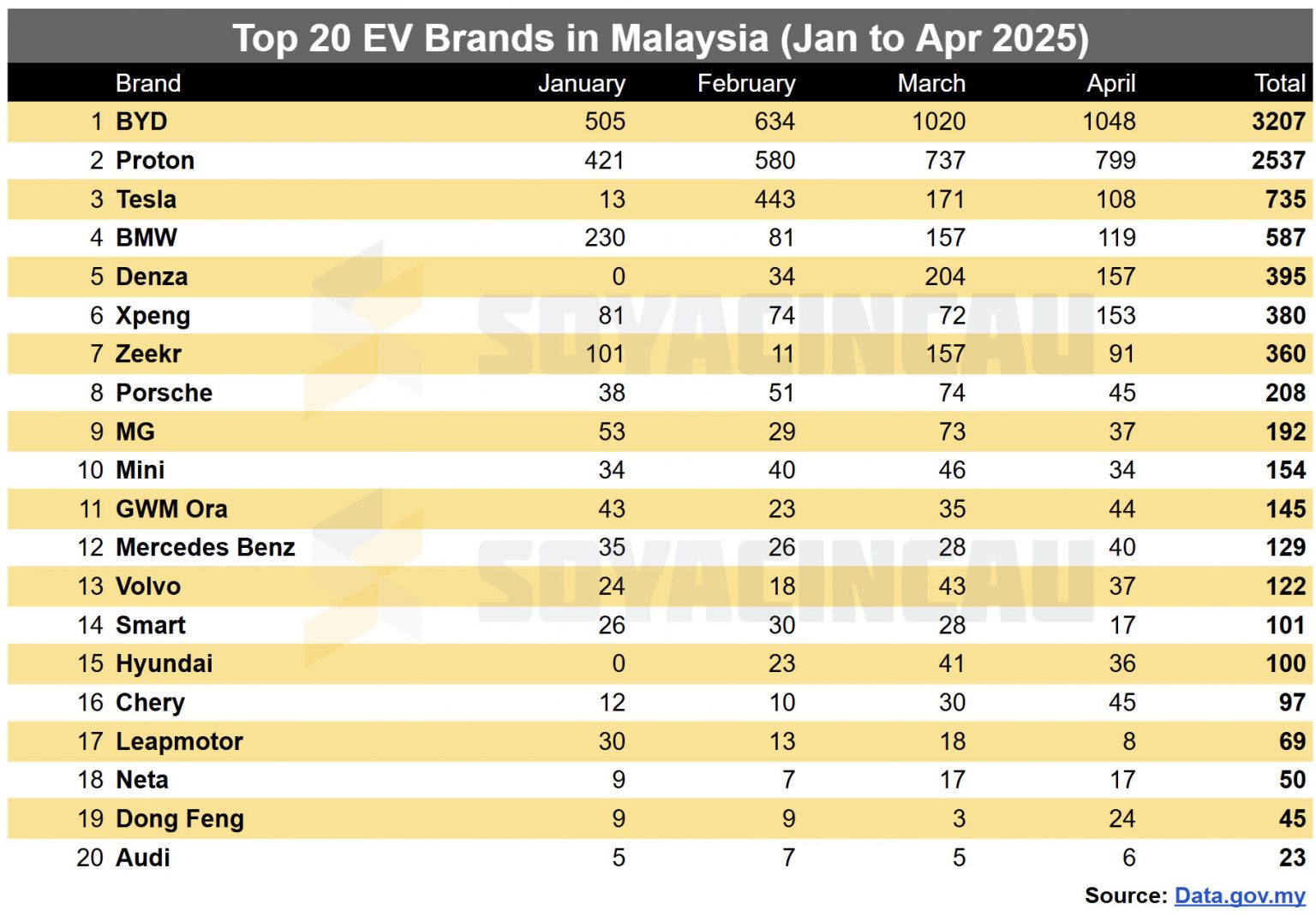 从品牌层面来看,比亚迪继续保持马来西亚电动车第一品牌地位,截至2025年4月共注册3207辆,这得益于其涵盖掀背车、轿车、SUV与MPV的广泛产品阵容。