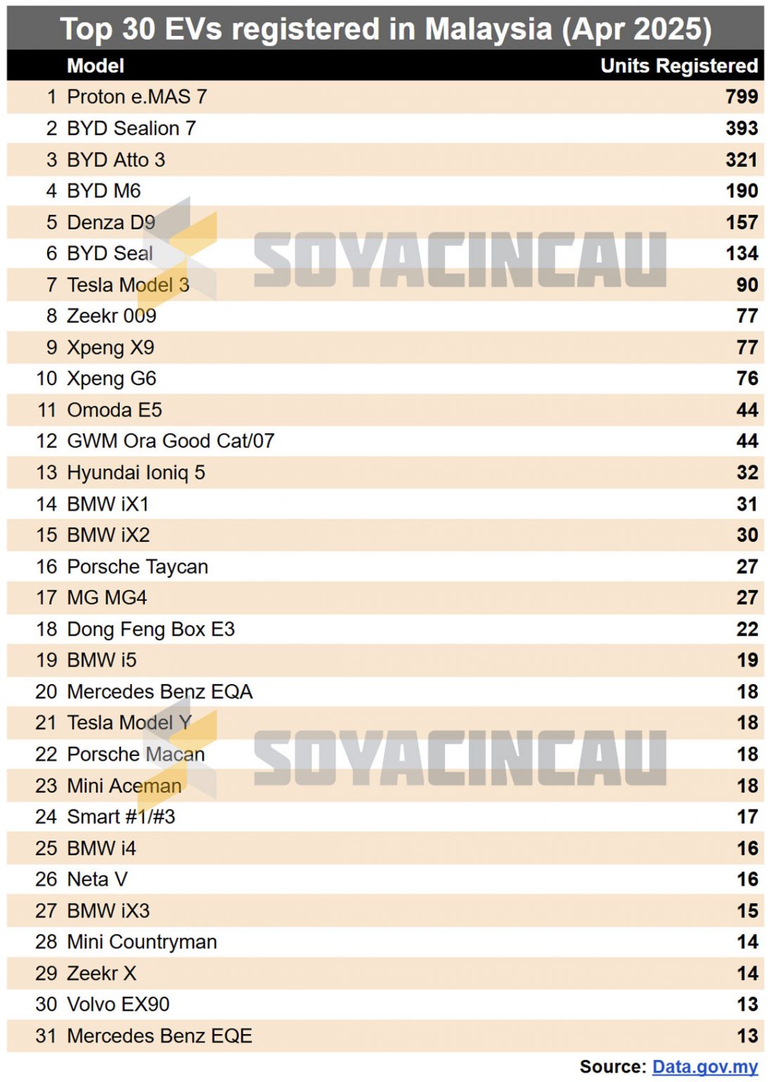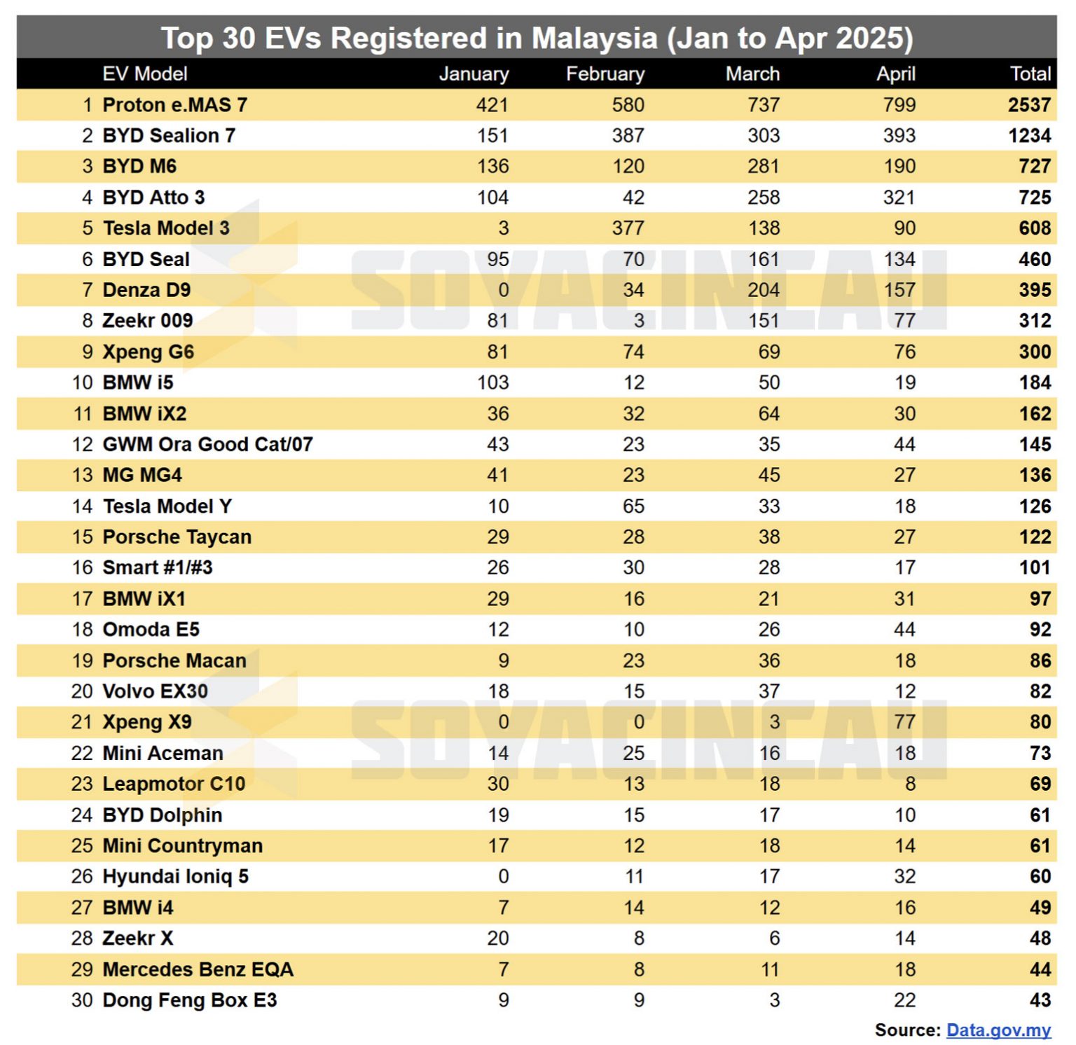 观察2025年前四个月注册量最高的30款电动车,Proton e.MAS 7持续增长,目前已注册2537辆。其次是比亚迪Sealion 7(1234辆)、比亚迪M6(727辆)、比亚迪Atto 3(725辆)以及Tesla Model 3(608辆)。