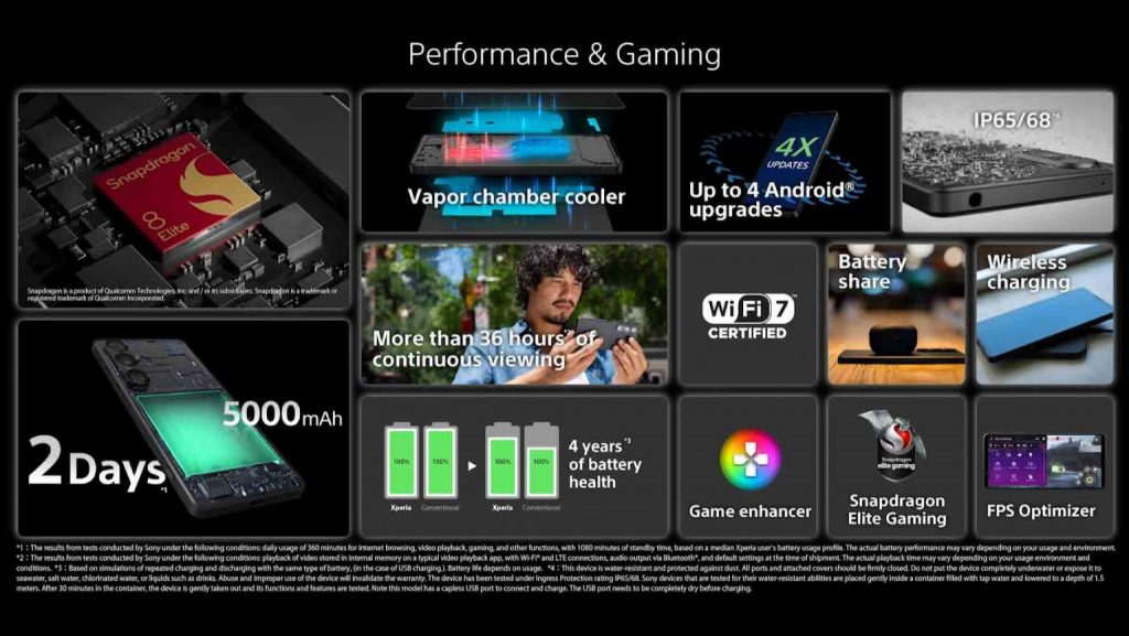 Xperia 1 VII 核心搭载 Qualcomm 最新旗舰处理器 Snapdragon 8 Elite,并内建一颗 5000mAh 电池,官方称单次充电可使用长达两天,支持 USB-C 30W 快充。