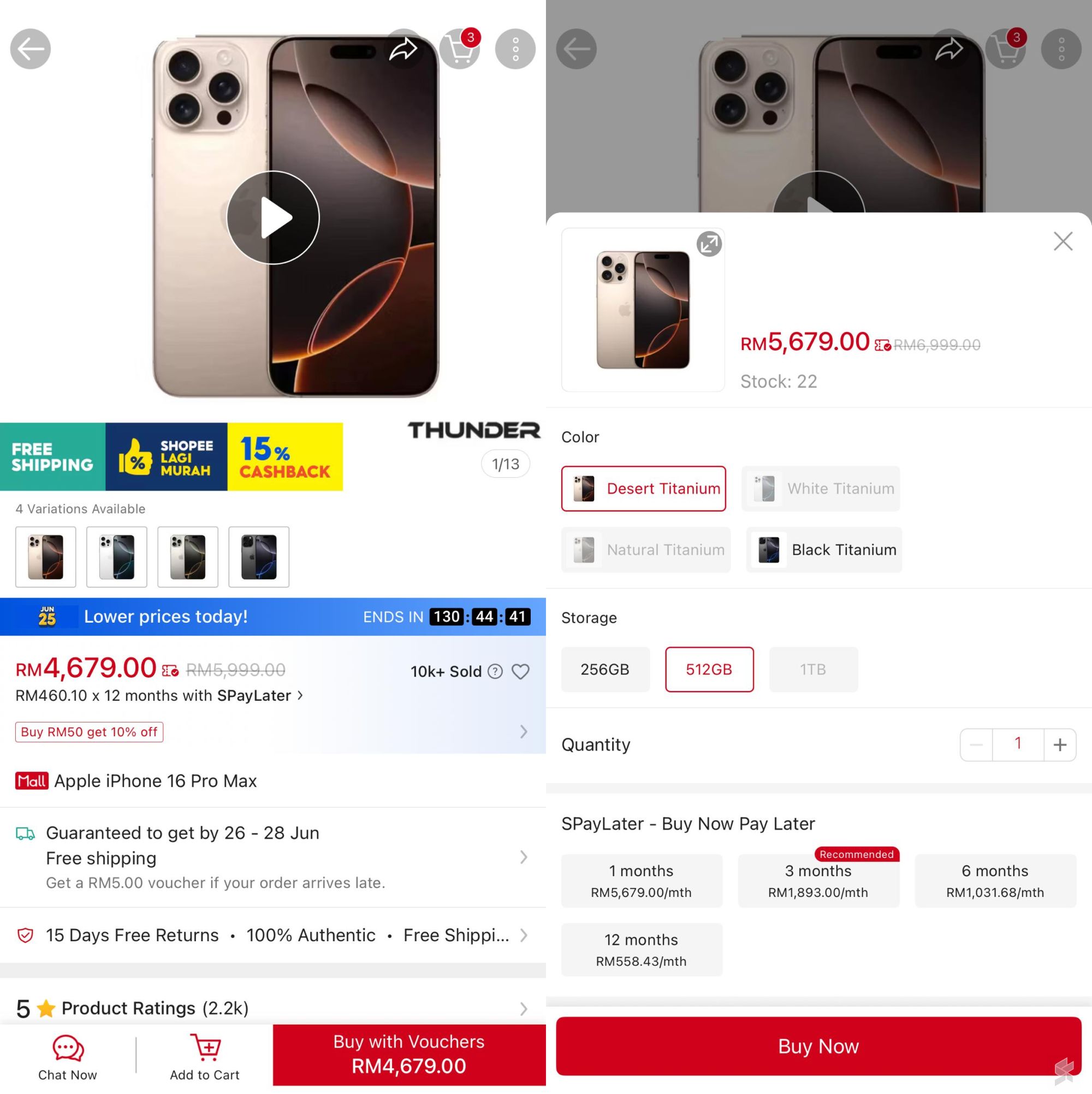 你可在TMT Thunder官方商店查看这些iPhone 16 Pro优惠信息,并通过Shopee手机应用程序(App)使用优惠券,以促销价购买。用户可通过SPayLater进行分期付款。