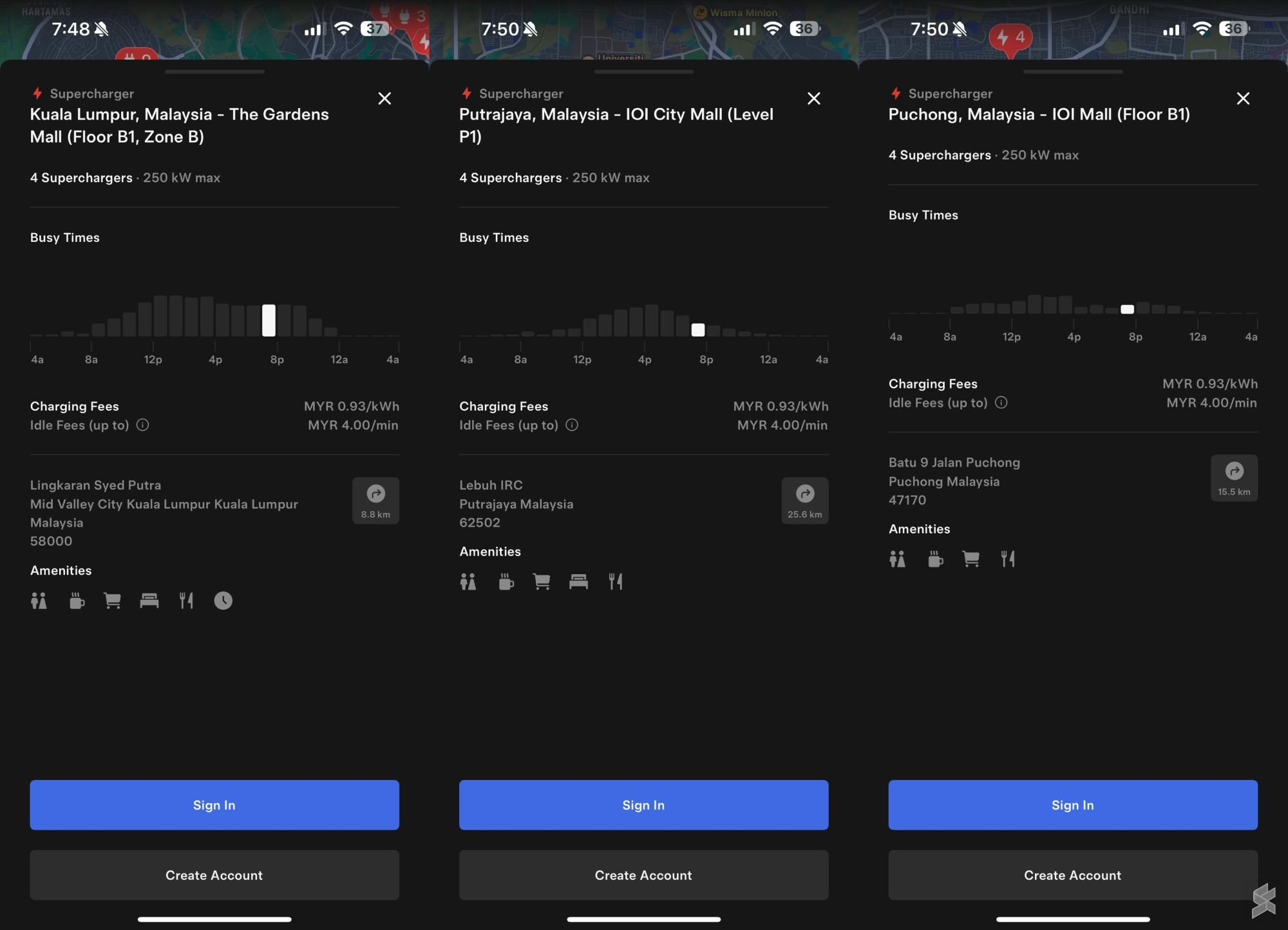 大多数特斯拉超级充电站都位于巴生谷地区,但请注意,并非所有地点都享受新的降价优惠。几家特斯拉超级充电站的充电费都降至每千瓦时93仙,包括The Gardens Mall、布城的IOI City Mall、蒲种的IOI Mall、吉隆坡柏威年广场(Pavilion KL)、武吉加里尔柏威年广场(Pavilion Bukit Jalil)、双威金字塔购物中心(Sunway Pyramid)以及布城的特斯拉服务中心(Tesla Service Centre)。