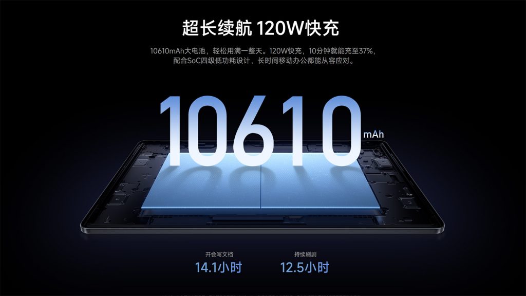 Xiaomi Pad 7S Pro搭载10610mAh 电池,可通过USB-C接口以120W功率充电。此外,该平板电脑还支持7.5W反向有线充电。