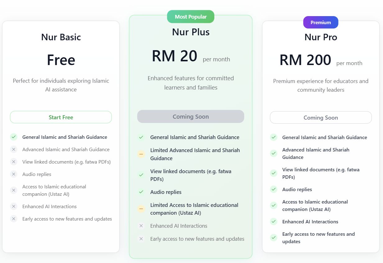 同时,Nur Pro配套提供Advanced Islamic 和 Shariah Guidance、Ustaz AI 的扩展访问权限、Enhanced AI互动以及新功能和更新的抢先体验。