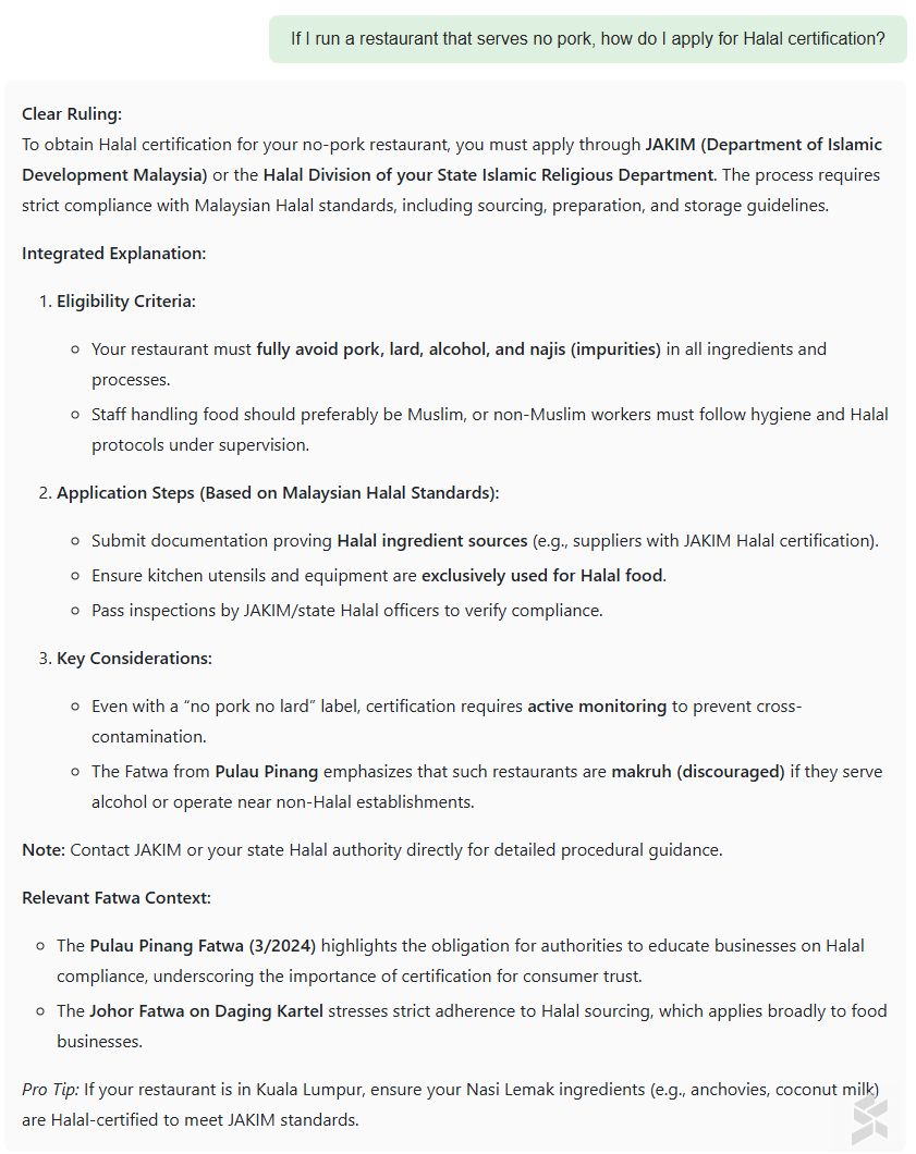NurAI 还可以提供有关清真事务的指导,例如如何为餐厅申请清真(Halal)认证。它确实提供了答案,包括资格要求、申请步骤和注意事项。如下所示,NurAI 还引用了其他相关的fatwa背景,例如 “Pulau Pinang Fatwa (3/2024)” 和 “Johor Fatwa on Daging Kartel”。