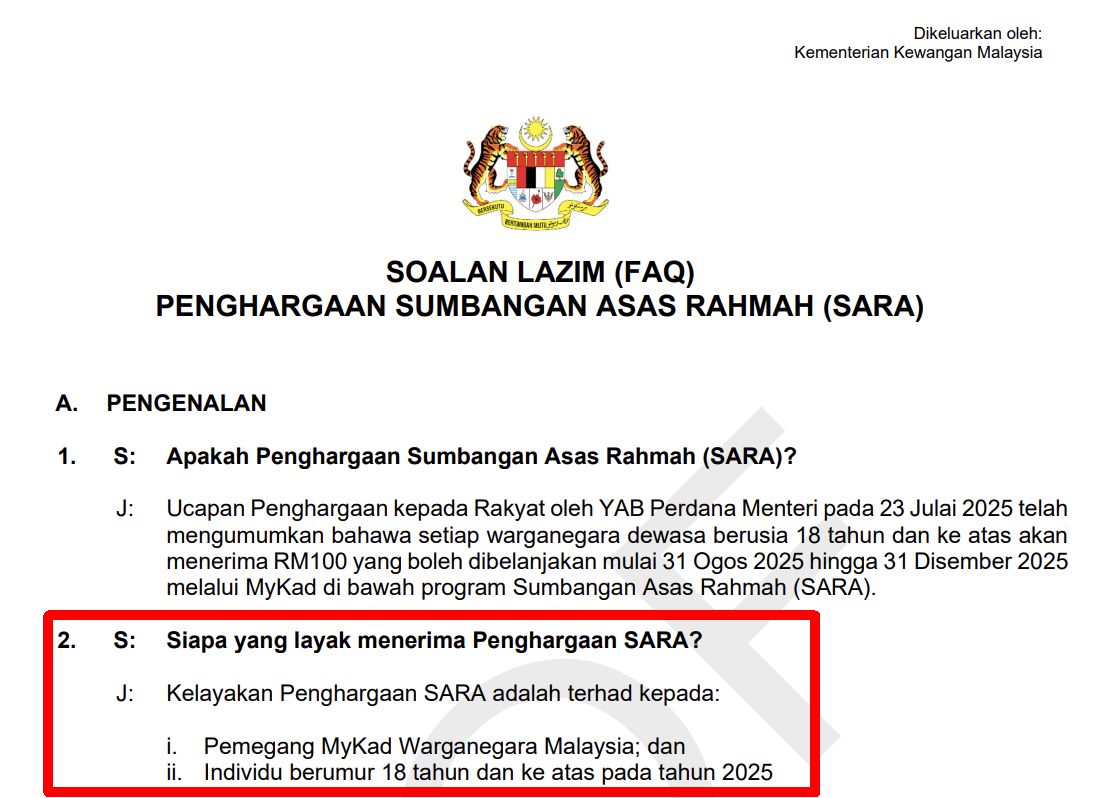 根据常见问答(FAQ),这笔一次性100令吉SARA援助金将发放给2025年已满18岁及以上、持有MyKad的马来西亚公民。