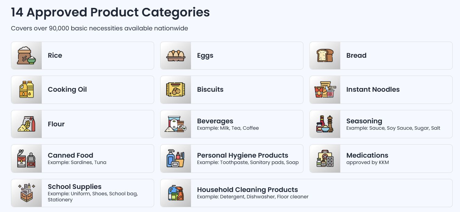 这笔援助金只能用来购买14类指定的基本用品,可在全马超过7300家参与商店使用,涵盖超过9万种商品。