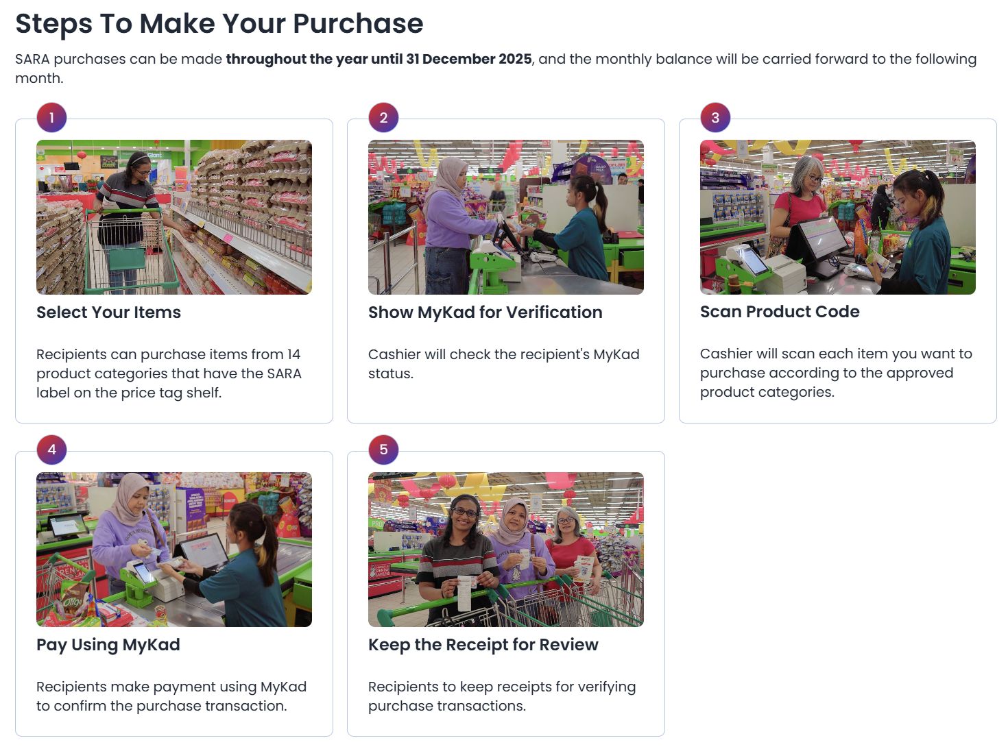 付款方式很简单:到参与超市的“基本关怀援助金(SARA)柜台”,出示MyKad进行验证。所有物品扫描完成后,你需要使用MyKad支付,并输入6位数密码。