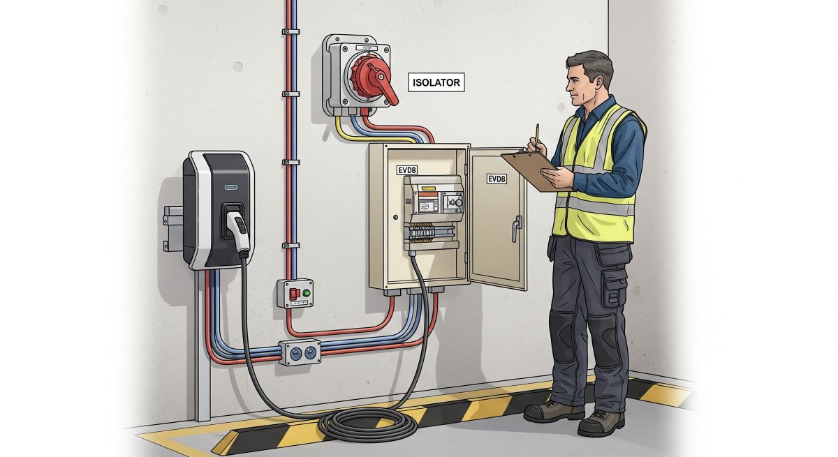 - 断路开关(隔离器)— 让你在维护或紧急情况下安全断开充电器。