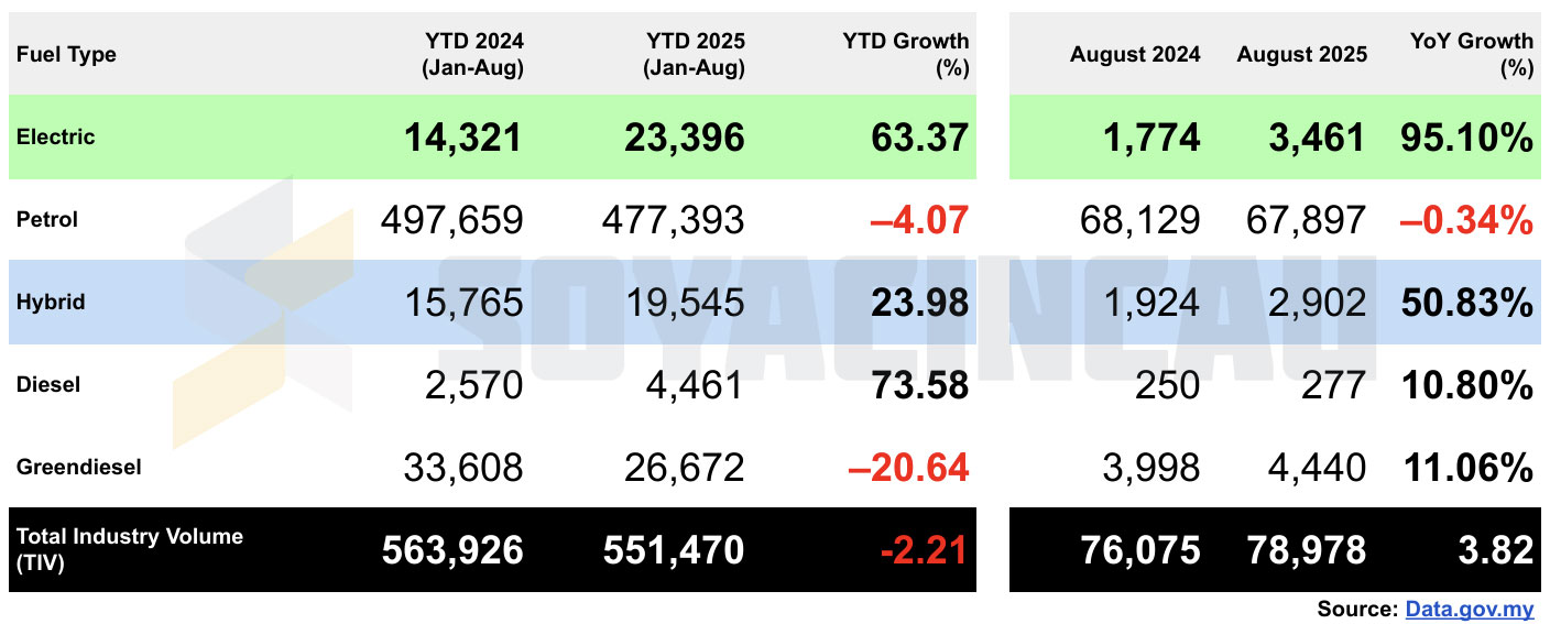 电动车(EV)持续展现强劲增长势头,根据道路交通局(JPJ)最新公布的车辆注册数据,2025年8月共有3461辆电动车注册,同比2024年8月的1774辆增长95%。