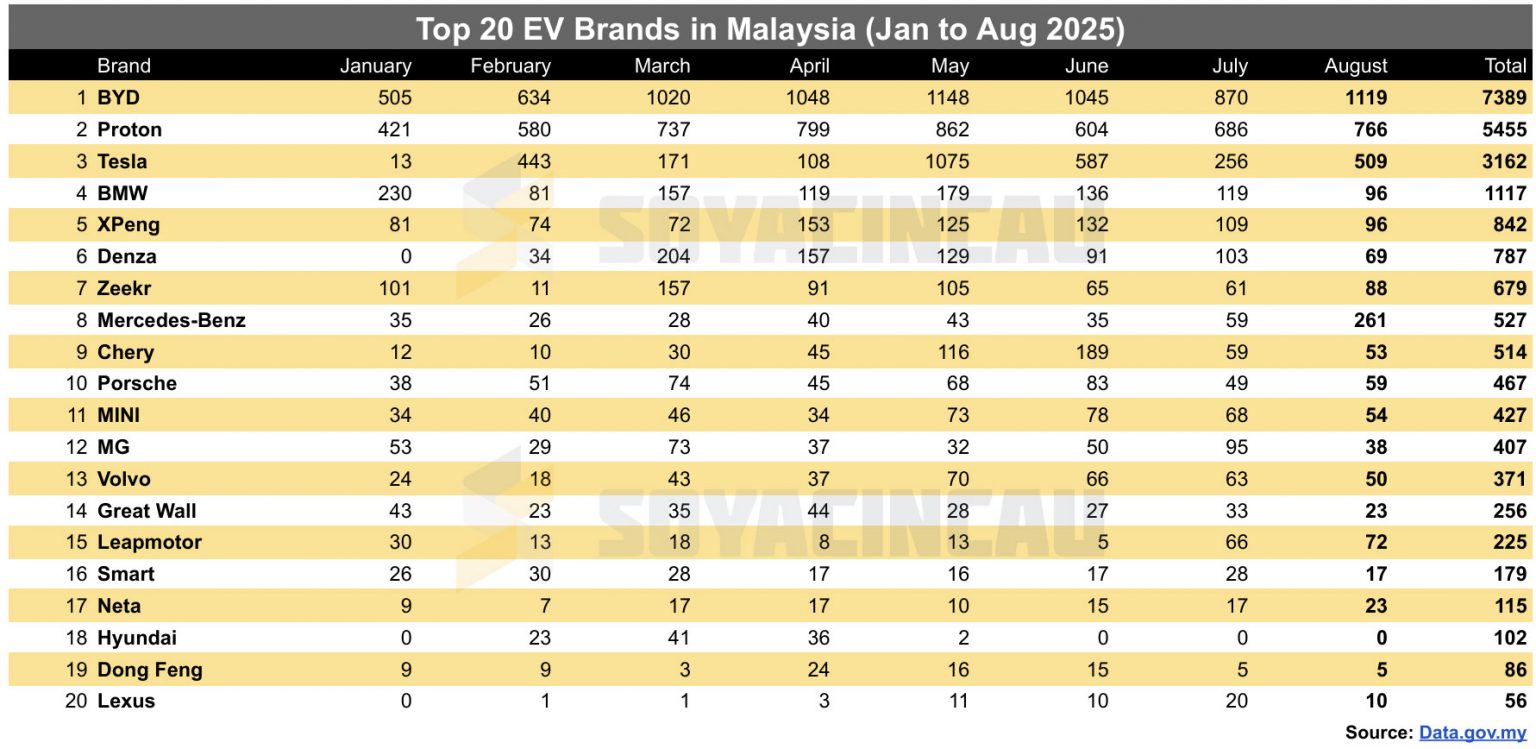 2025年1月至8月马来西亚电动车销量前20名品牌