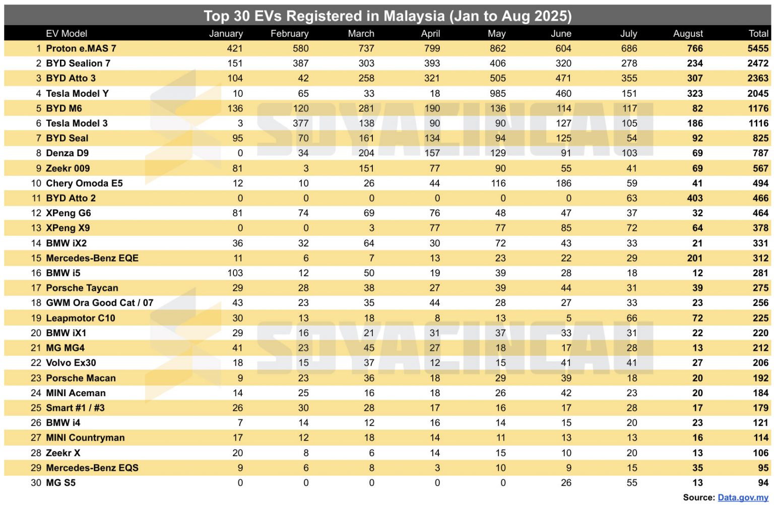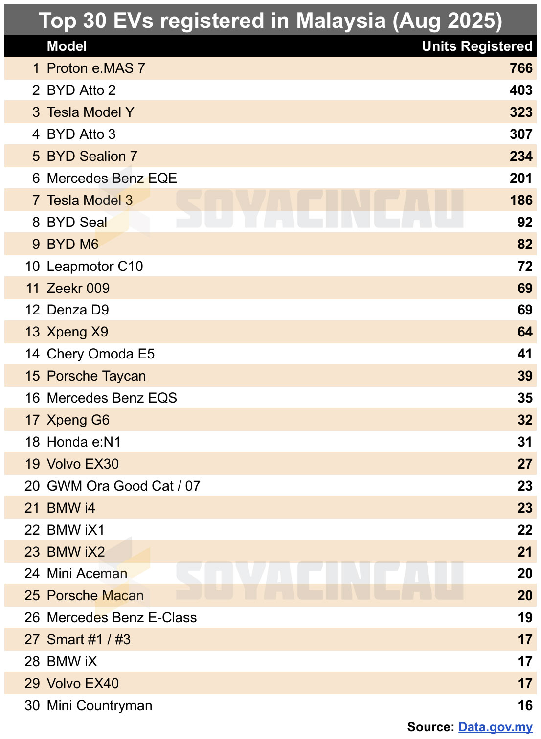 Proton e.MAS 7继续稳居第一,8月注册量为766辆。新上市的比亚迪Atto 2以403辆排名第二,特斯拉Model Y则以323辆位列第三。