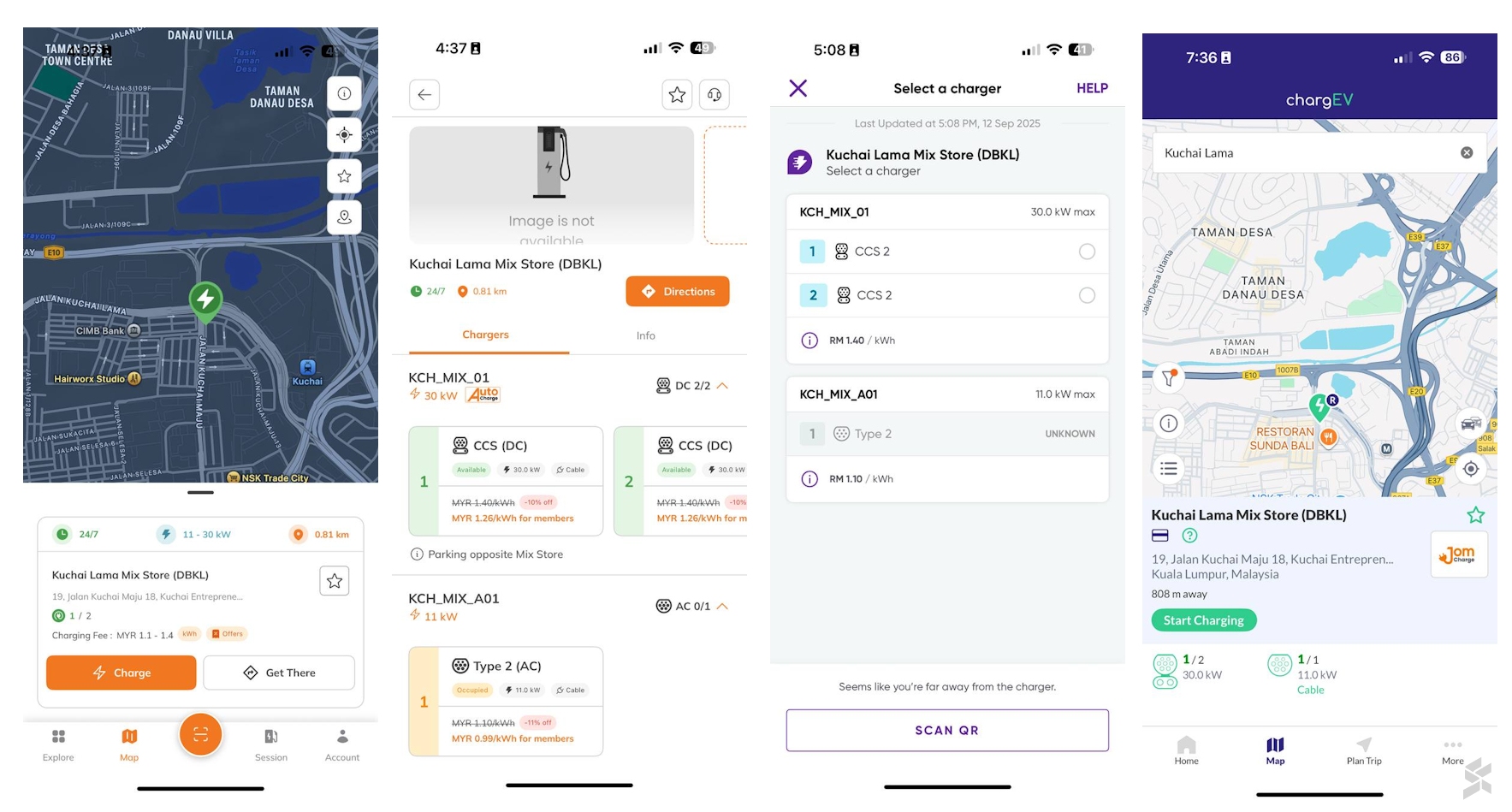 (左起):新充电桩已出现在JomCharge(图1和图 2)、Gentari Go(图3)和ChargEV(图4)等手机应用程序。