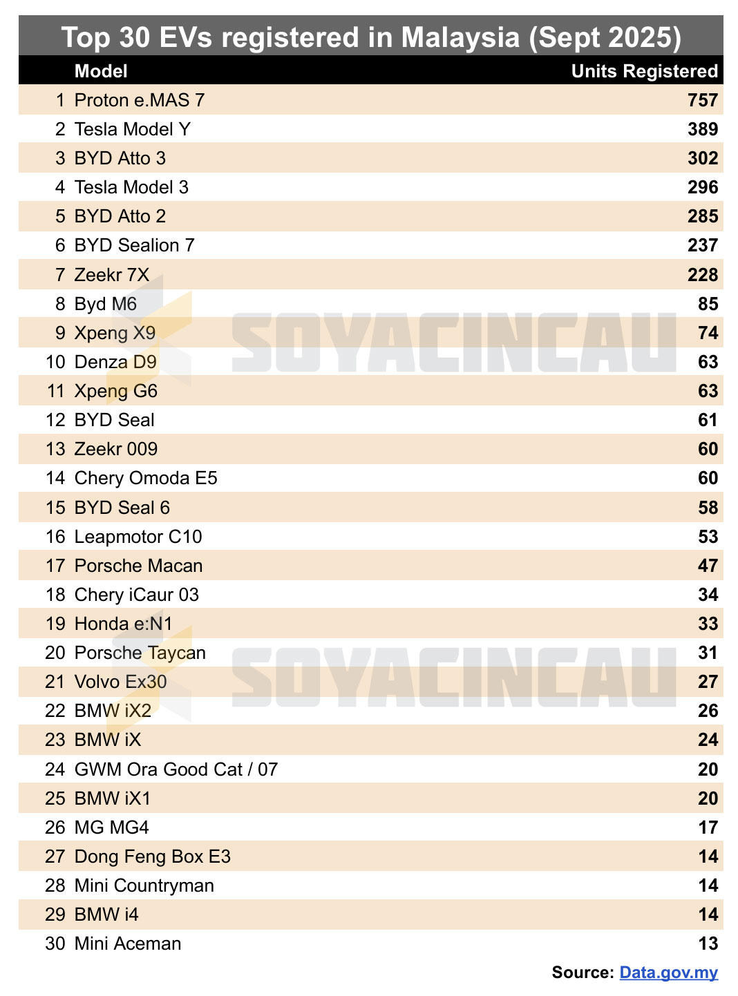 从2025年1月至9月累计销量来看,Proton e.MAS 7仍以6212辆的注册量位居榜首,其次是BYD Sealion 7,注册量为2709辆。BYD Atto 3以2665辆的注册量排名第三,紧随其后的是Tesla Model Y的2434辆,以及Tesla Model 3的1412辆。