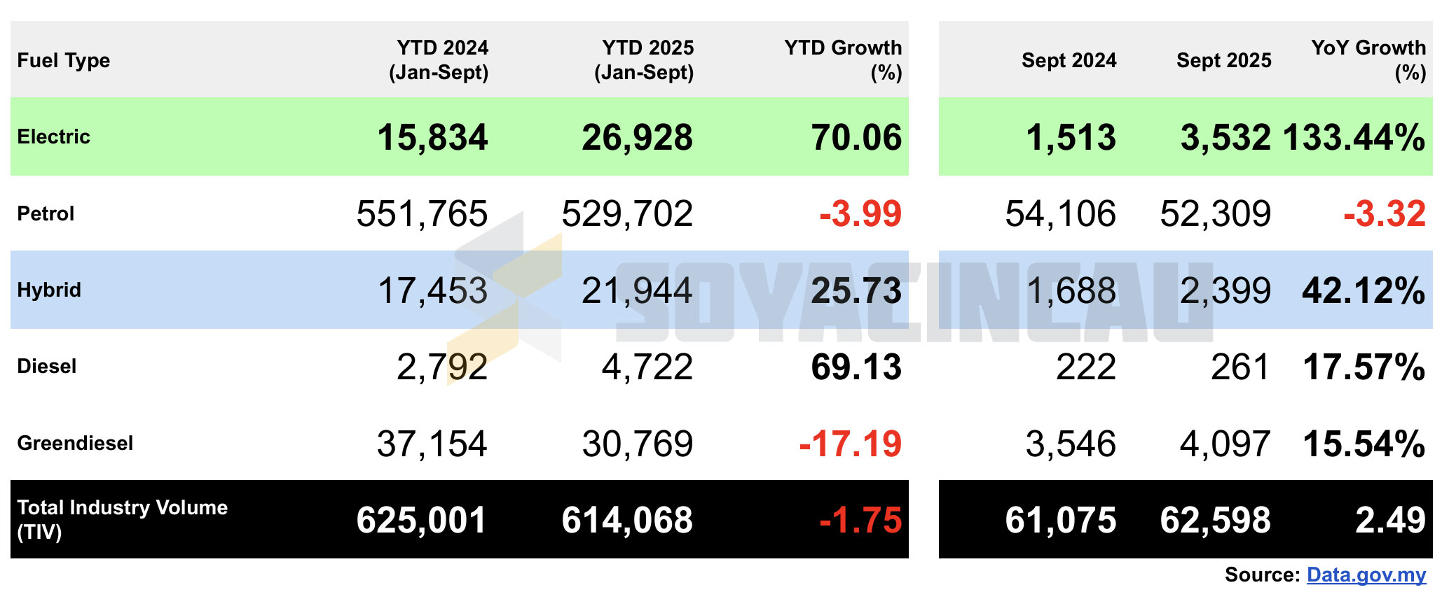 在9月份,电动车注册量同比(YoY)增长133.44%,从2024年9月的1513辆增至2025年9月的3532辆。上个月,电动车占全行业总登记量的5.64%。