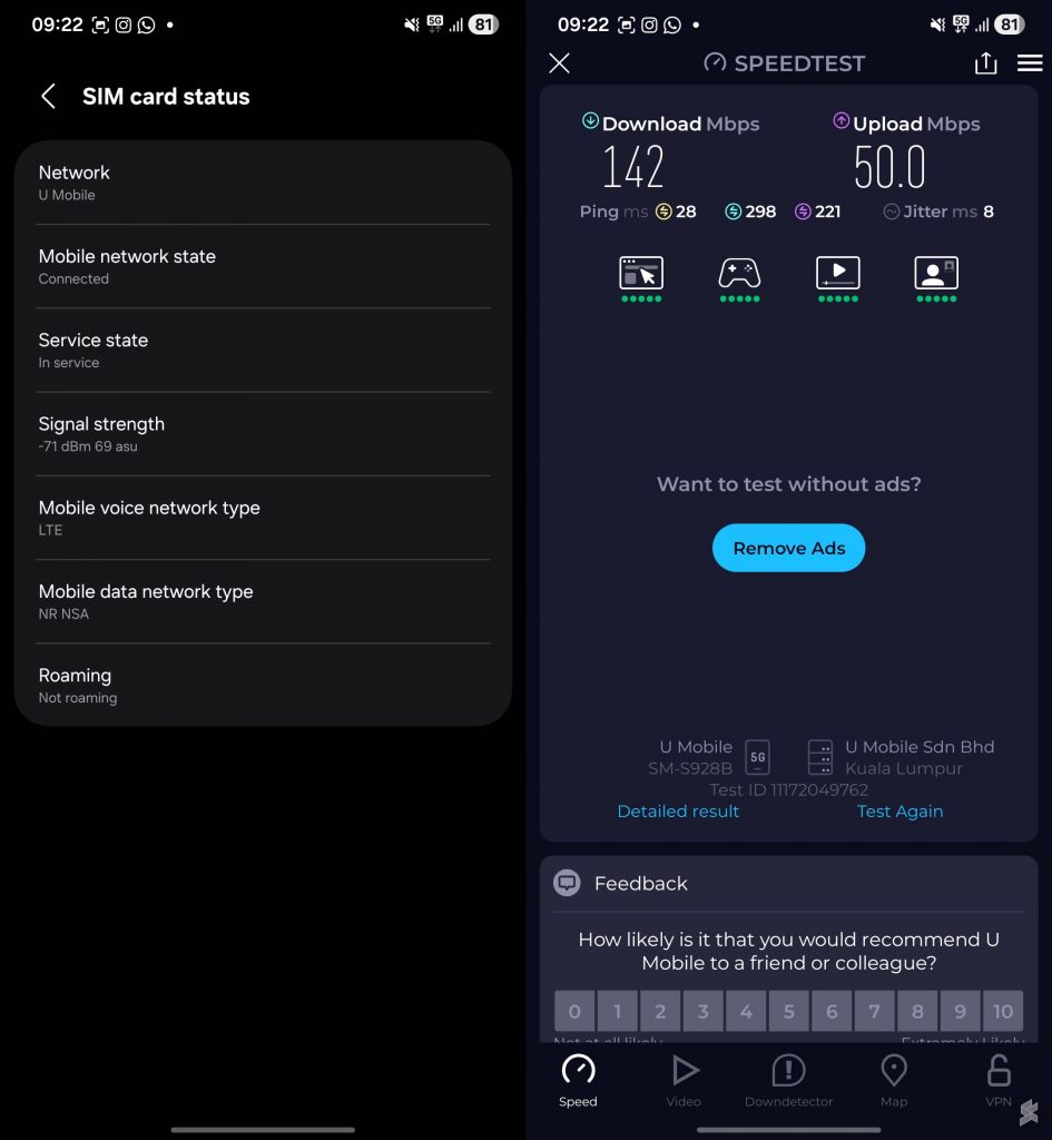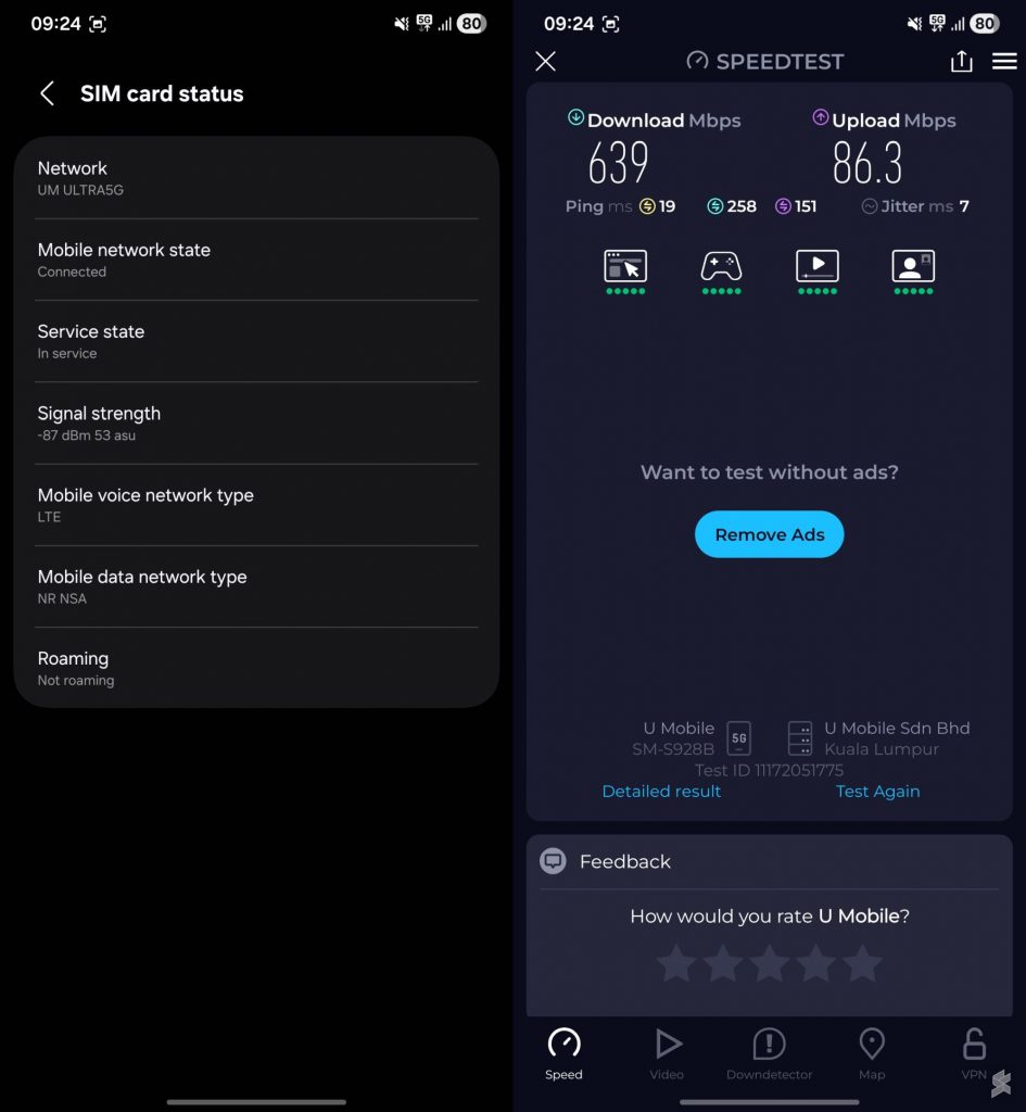 从性能来看,U Mobile自建的ULTRA5G网络确实展现出更高的下载与上传速度,介于357Mbps至682Mbps之间。这可理解为DNB网络目前由多家电讯公司共用,活跃用户更多,而U Mobile自有网络的使用负载相对较低。