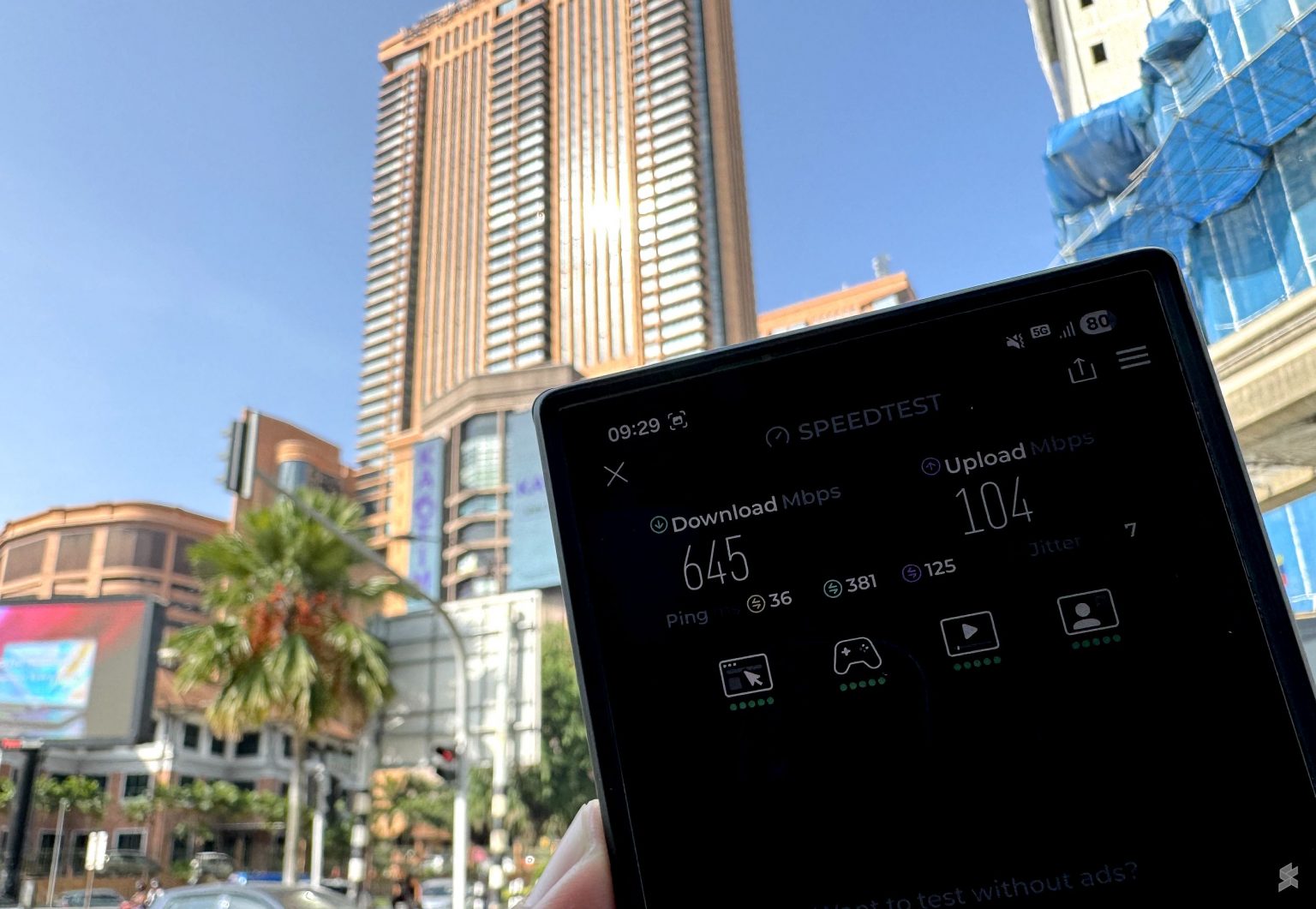 本次测试在吉隆坡多处户外地点进行。为确保连接的是U Mobile自建网络,我们多次尝试让Galaxy S24 Ultra连接至“UM ULTRA5G”。若手机几分钟后仍未自动切换,我们会开启并关闭“飞行模式”,让装置重新搜索ULTRA5G信号。