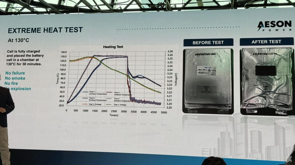 Aeson Power 强调,其电池特别适合马来西亚高温气候,能在 高达摄氏80度 的条件下长期运作;即便在 摄氏60度环境下储存一个月,仍能保持 超过85%的电量容量。