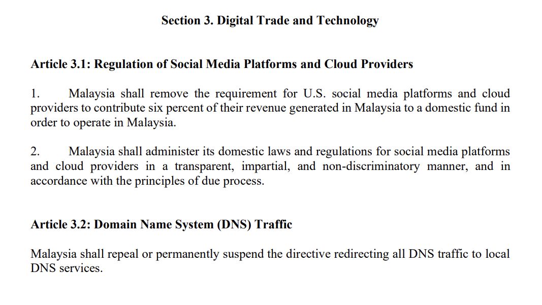 值得关注的是,协定也涉及2024年曾引起争议的DNS流量重导向事件。根据协定,马来西亚必须废除或永久暂停将所有DNS流量导向本地服务器的指令。