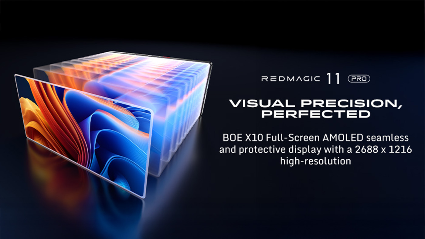 RedMagic 11 Pro正面采用京东方(BOE)提供的6.85英寸144Hz AMOLED显示屏,分辨率为2688×1216。该面板还拥有3000Hz的即时触控采样率和1800尼特的峰值亮度。