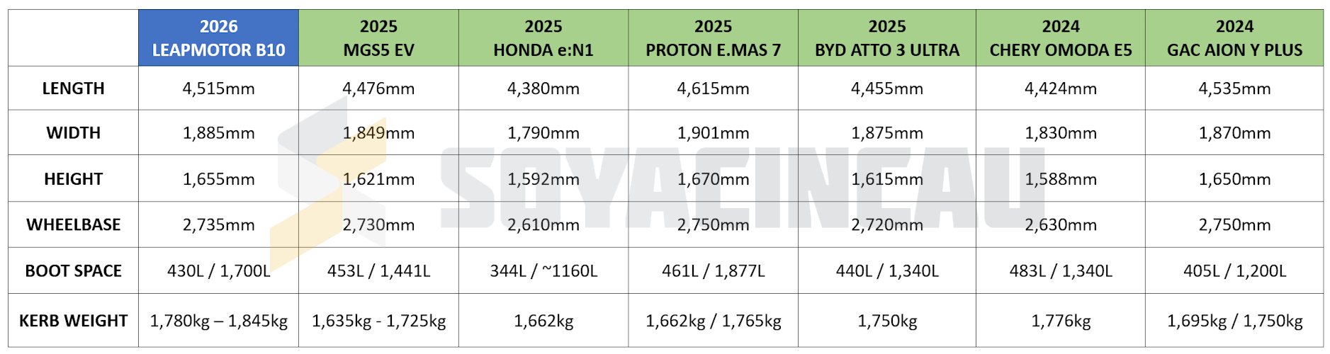 Leapmotor B10是一款C级电动SUV,定位低于Leapmotor C10,其直接竞争对手是宝腾(Proton)e.MAS 7,两者马达输出功率相近,但B10提供更快的直流充电速度。