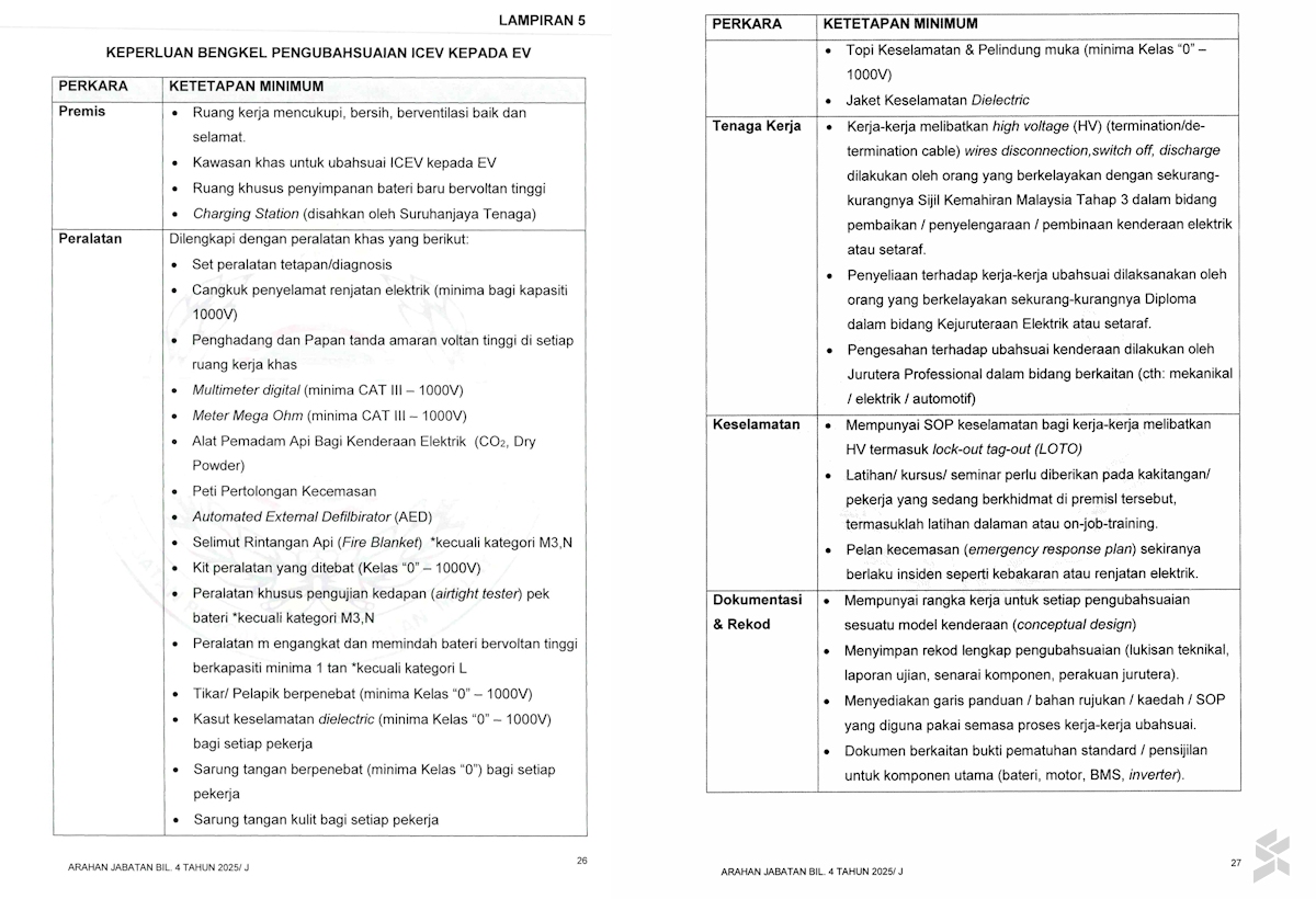 这不仅需要合适的场地,还需要技术熟练、知识丰富的人员。正如指南附录及第5.3.3条所述,电动车改装过程中某些高压作业,只能由持有马来西亚技术证书(SKM)第三级:电动及混合动力汽车维修或同等资格的技术人员进行。