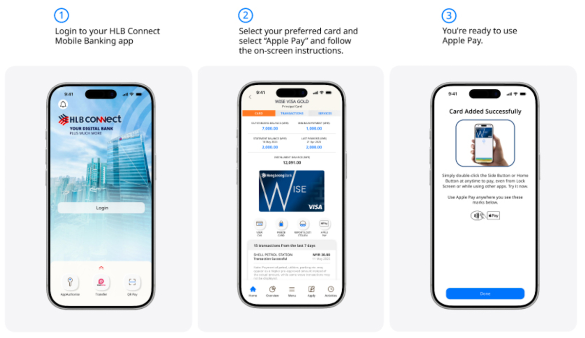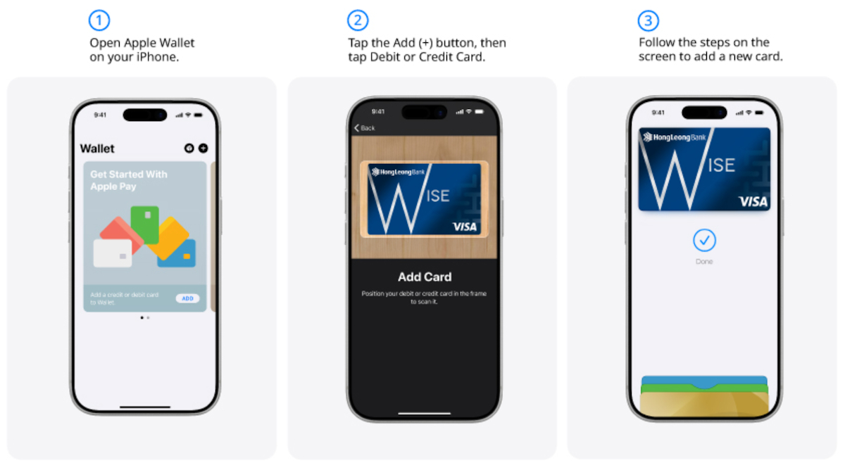 通过Apple Wallet为HLB Visa卡启用Apple Pay的步骤。
