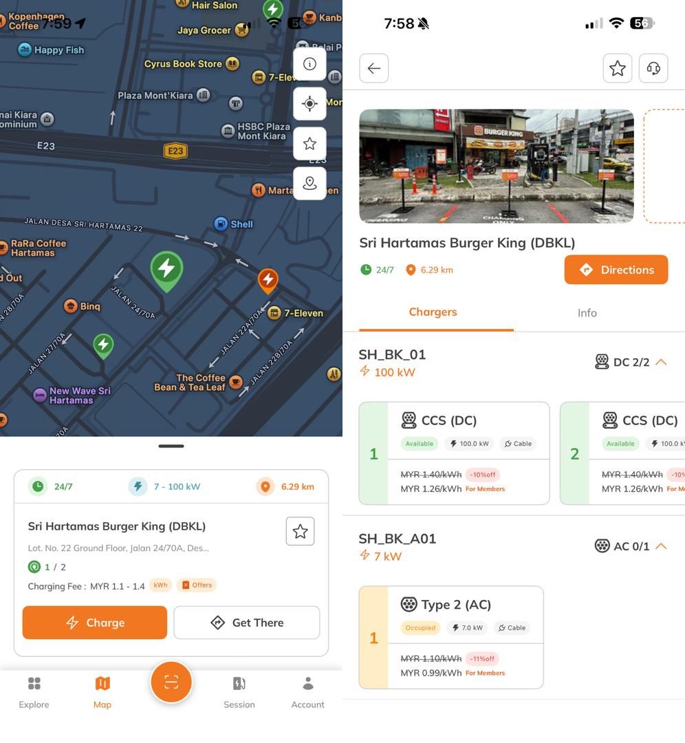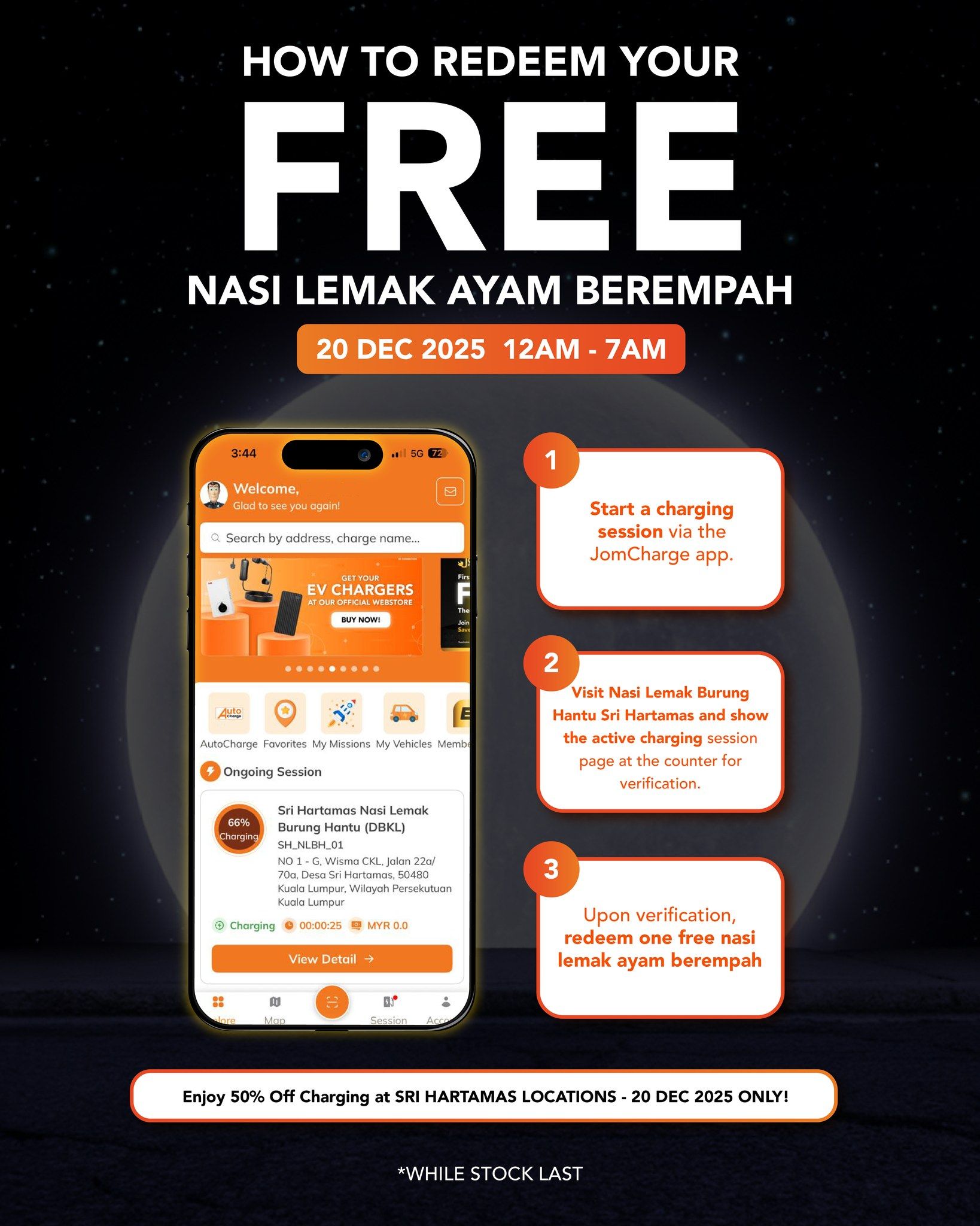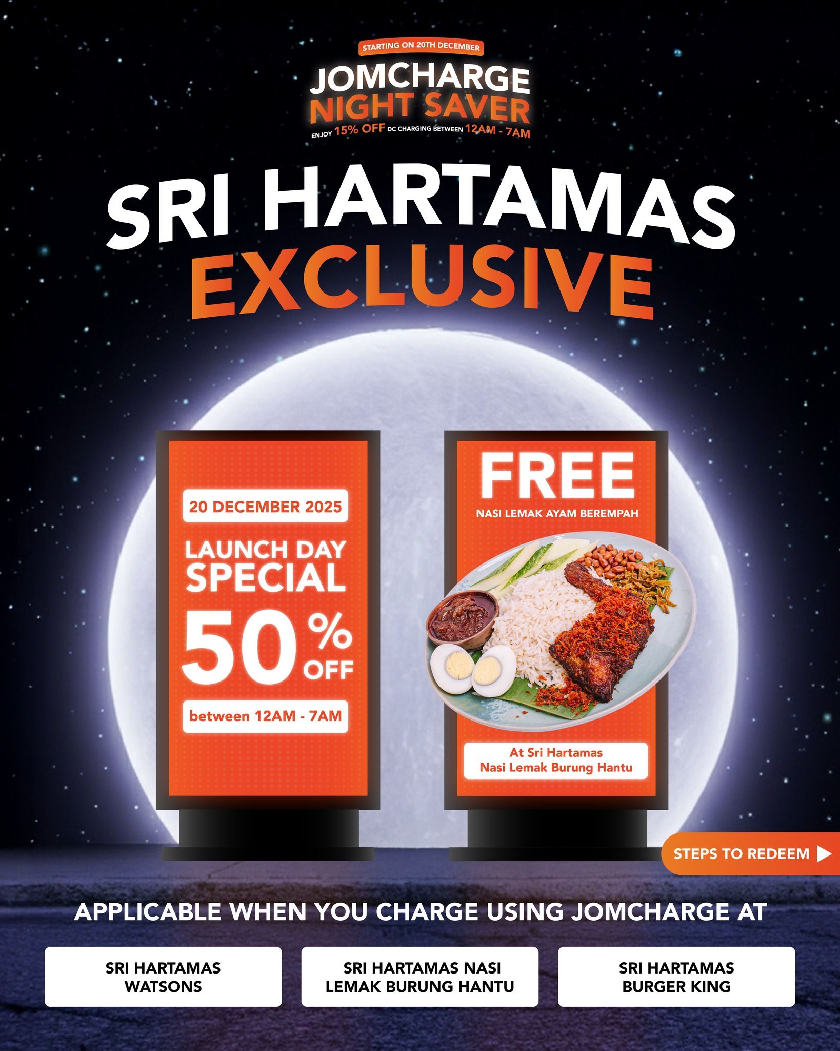 12月20日(周五)凌晨12时至早上7时,你可在Sri Hartamas Watsons、Sri Hartamas Nasi Lemak Burung Hantu和Sri Hartamas Burger King享受直流充电费50%的折扣。