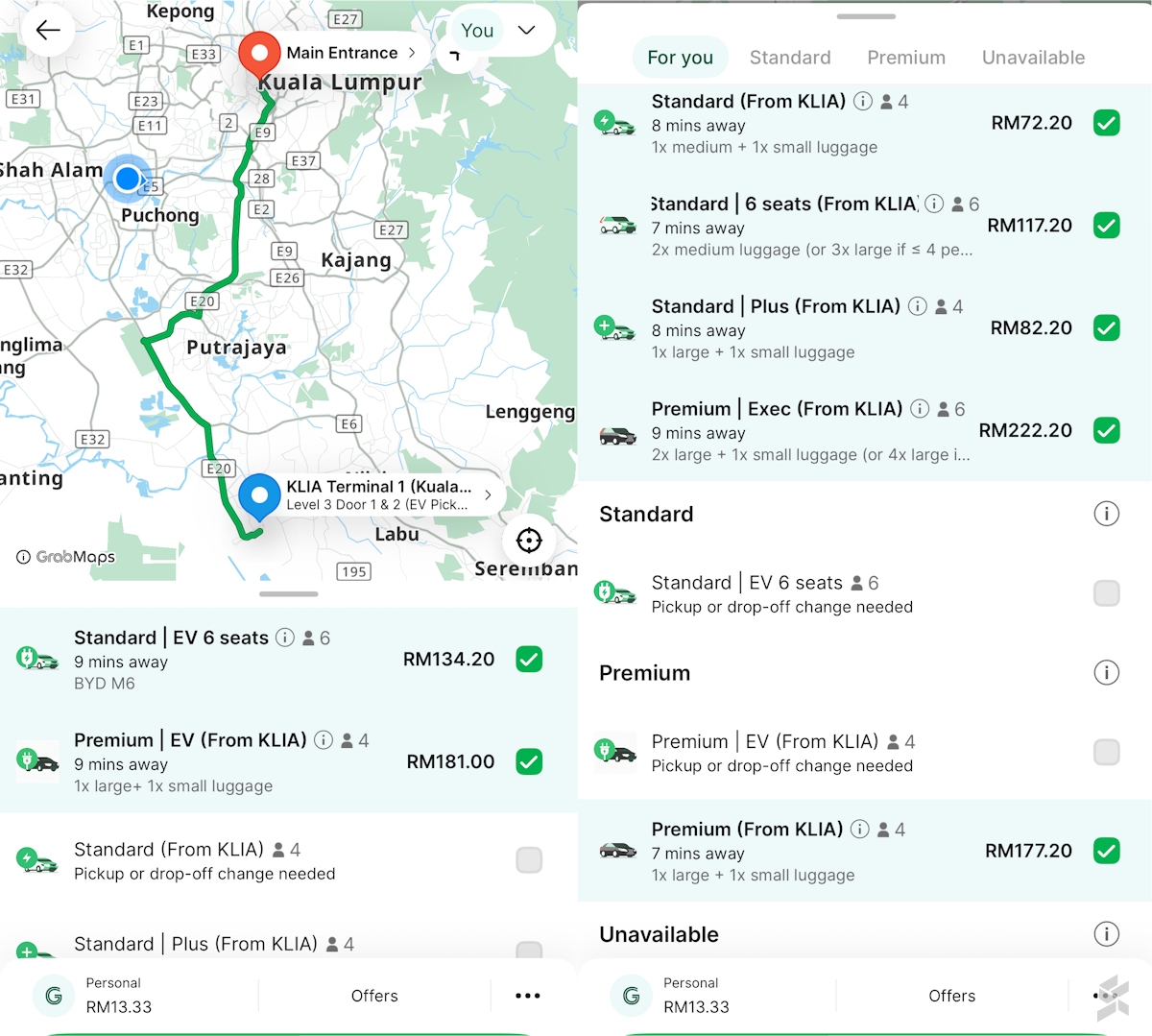 如果你错过了我们之前的报导,Grab EV车型的价格高于汽油版车型。我们快速查询了从KLIA到我们位于武吉免登(Bukit Bintang)办公室的行程,发现Grab EV的Leapmotor C10车型与非电动四人座Premium车型之间相差3.80令吉。