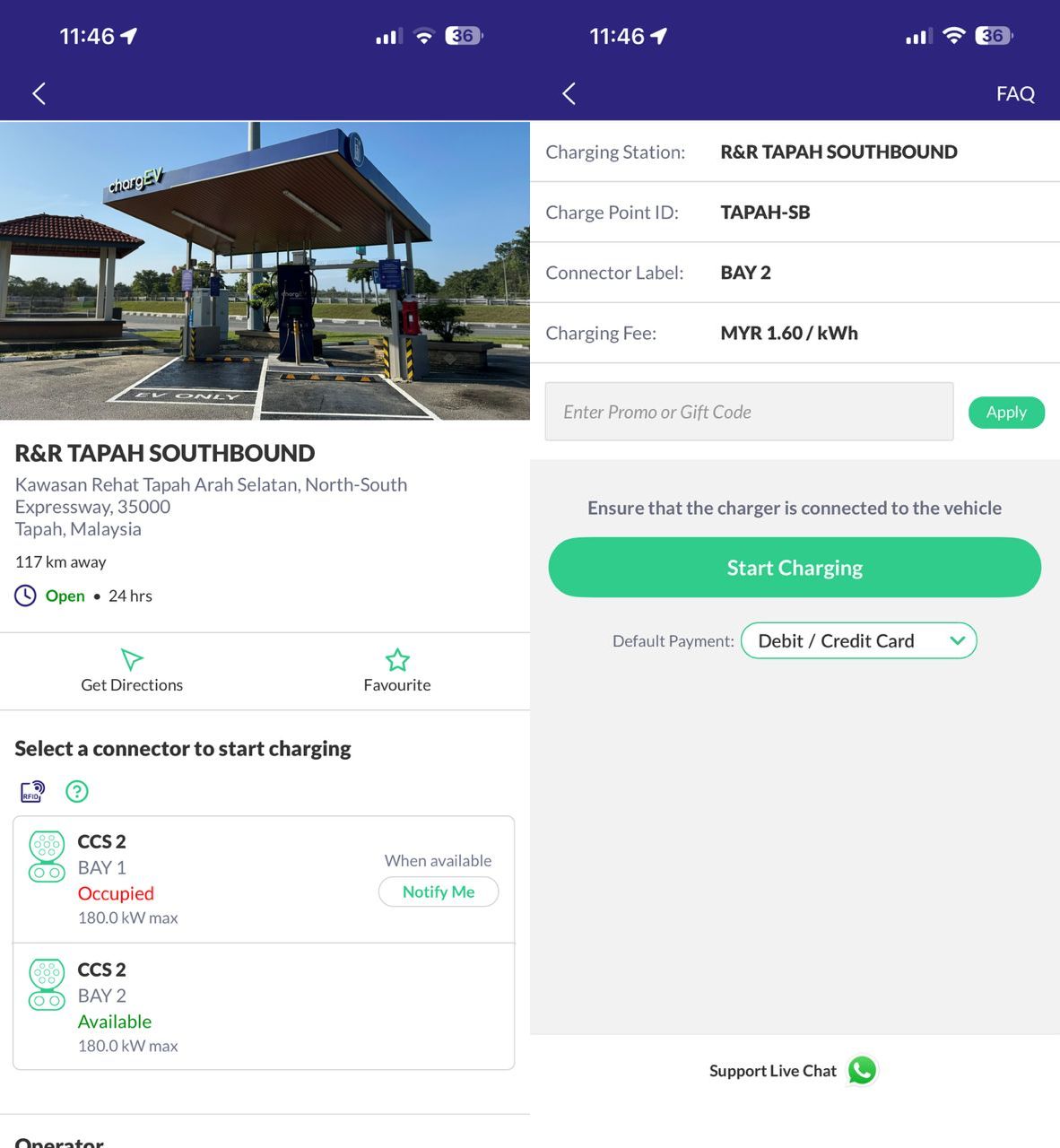 在打巴休息站(南下方向),ChargEV设有一台有遮棚的直流充电器,配备两个CCS2充电枪。随着功率升级,充电价格也从每千瓦时1.40令吉,上调至每千瓦时1.60令吉。