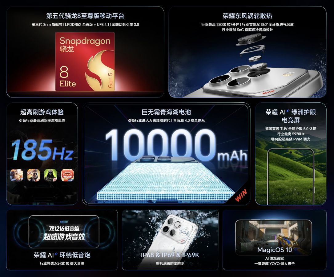 Honor Win系列定位为电竞手机,拥有极致的性能、更出色的散热系统以及10000mAh的超大容量电池。更令人印象深刻的是,这些设备比iPhone 17 Pro Max还要轻薄。