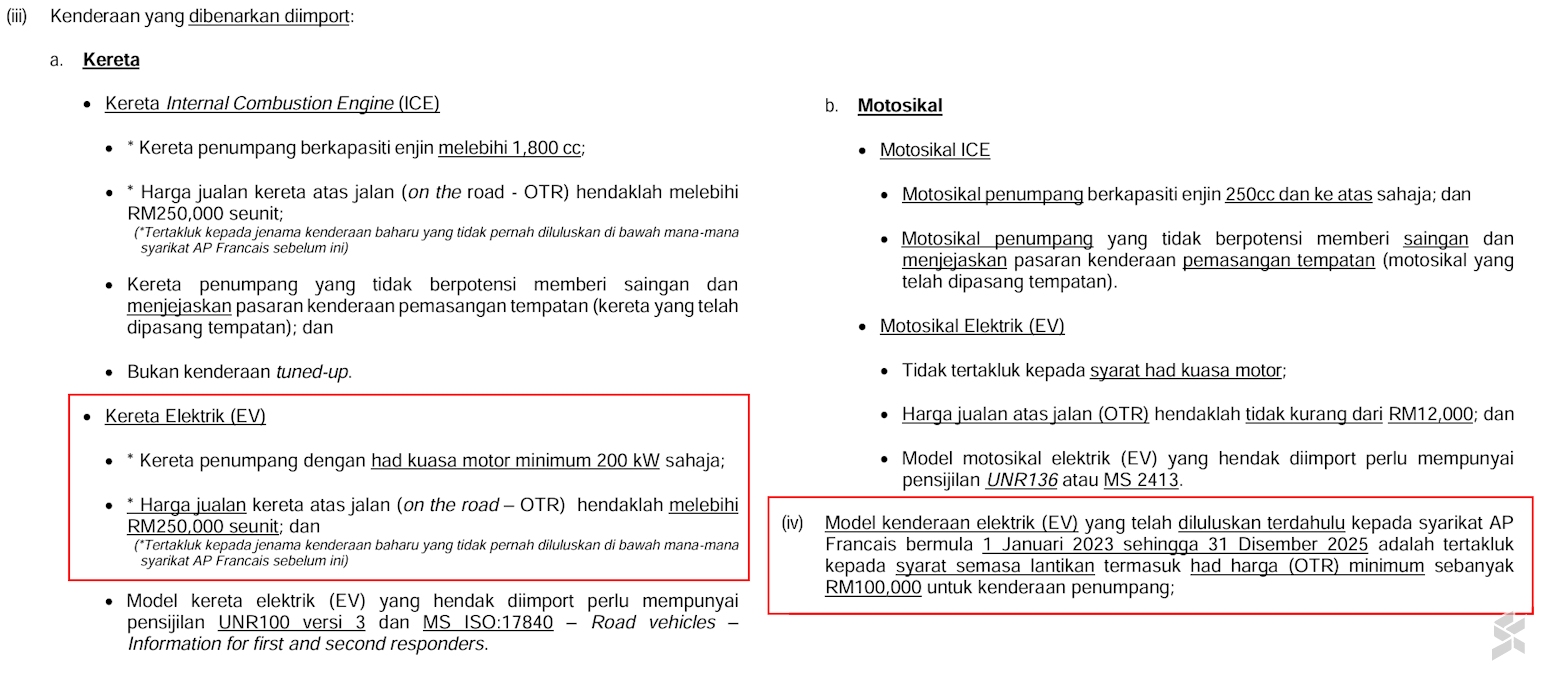 投资、贸易及工业部(MITI)最近在网站上更新了特许汽车入口准证(Franchise Approved Permit)指南。其中一项新变化是,大马整装进口(CBU)电动车的最低价格为25万令吉。