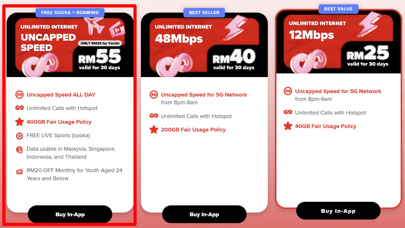 Yes Infinite Basic 以每月38令吉提供无限4G与5G数据、且不设网速上限,拿下铜奖。该配套还包括无限通话、20GB 热点数据,以及在新加坡的10GB 免费漫游数据;在新加坡漫游期间,拨打与接听任何大马号码皆免费。