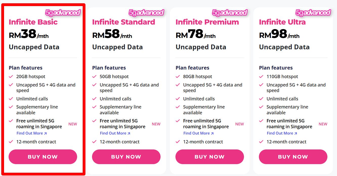 需注意的是,该配套附带12个月合约期,非常适合经常往返新加坡的用户。同时,Infinite Basic 也是全国范围内最便宜、支持5G Advanced的配套之一。