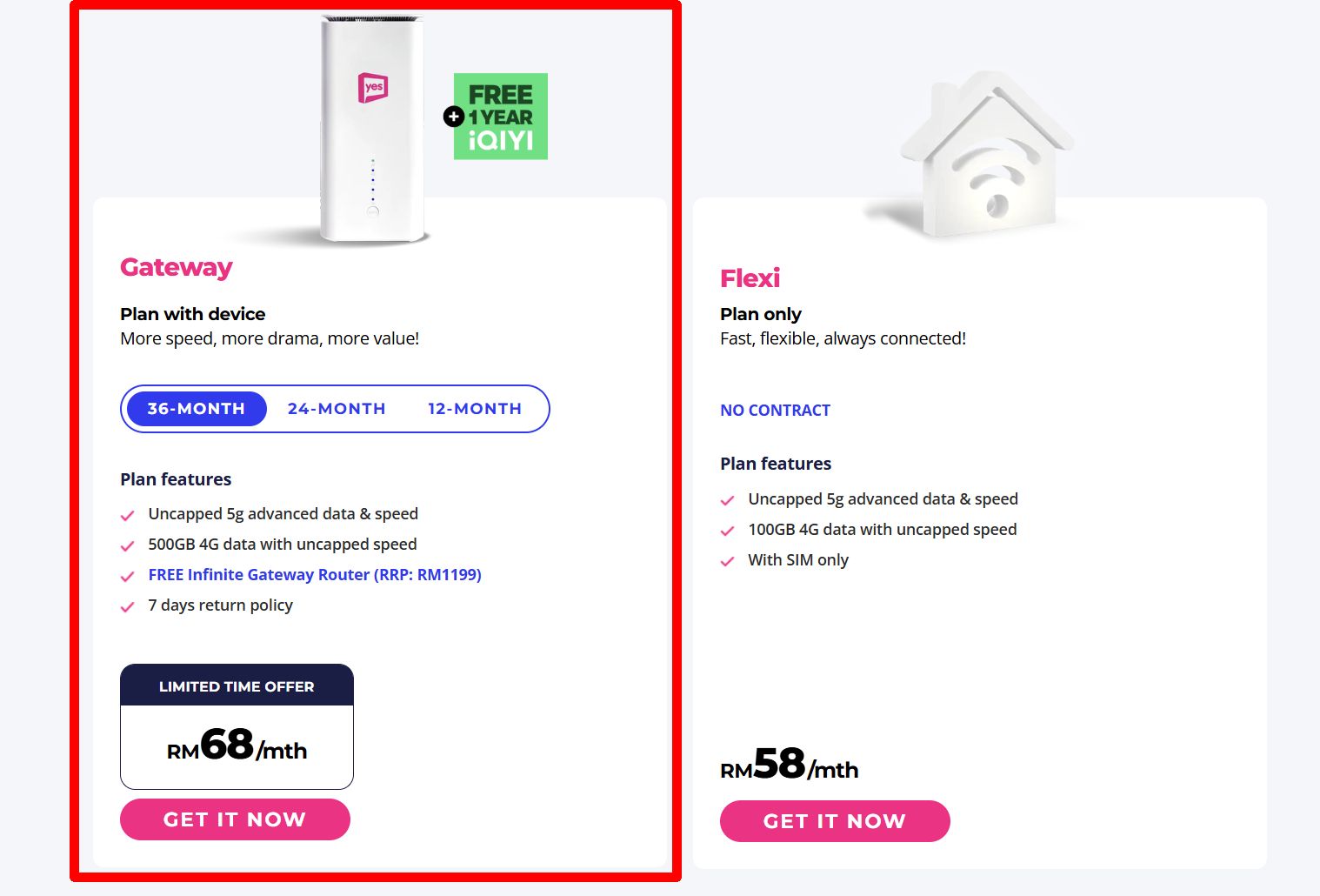 若你所在地区覆盖 DNB 的5G网络,这将是光纤宽频的理想替代方案。Yes 也开始捆绑赠送为期1年的 iQIYI 订阅服务,同时仍是大马唯一提供5G Advanced的家用宽频服务。若所在地区未覆盖5G,需注意4G 使用将设有500GB 配额。