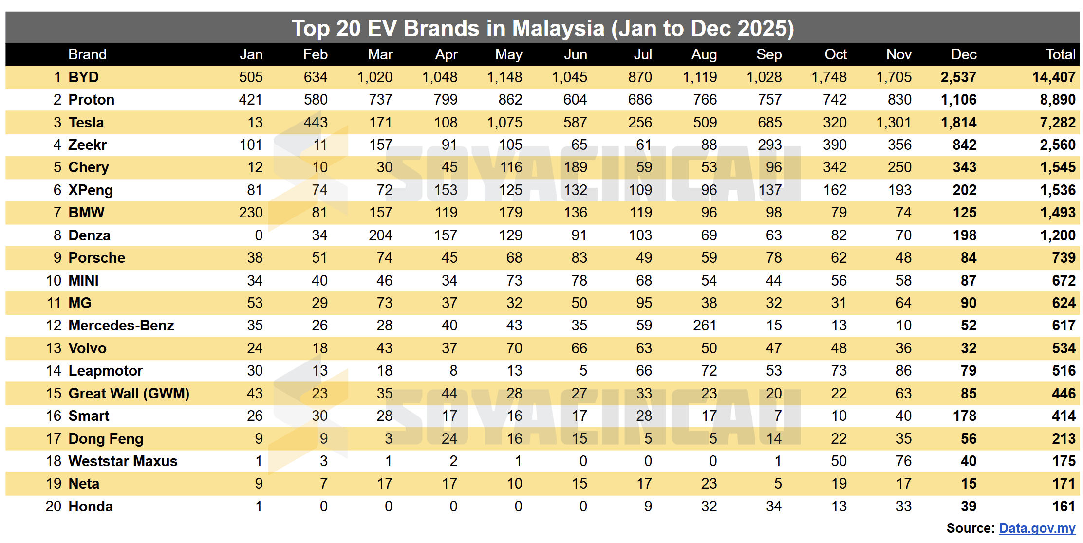 2025年1月至12月马来西亚20大电动车品牌