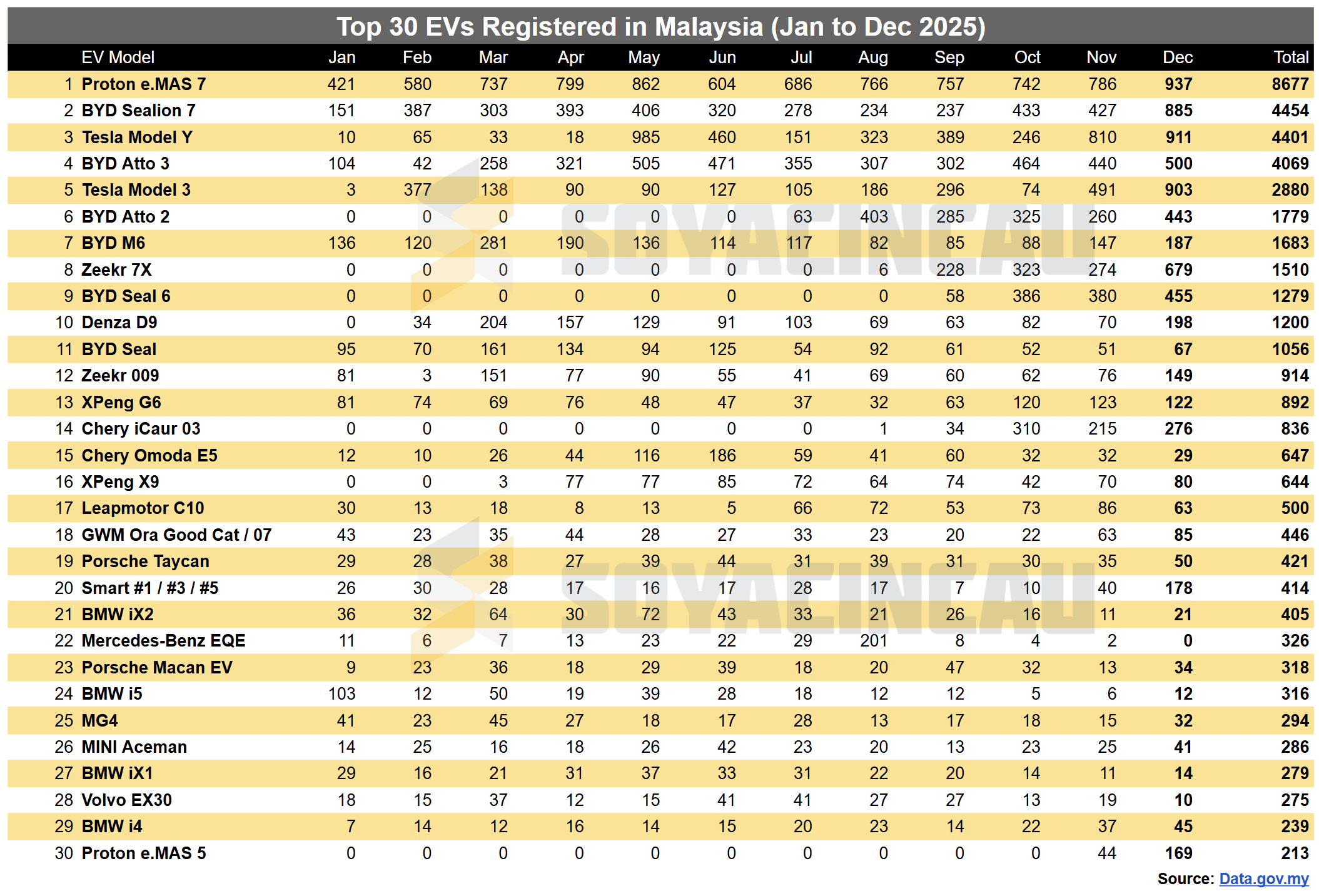 2025年1月至12月马来西亚排名前30的电动车