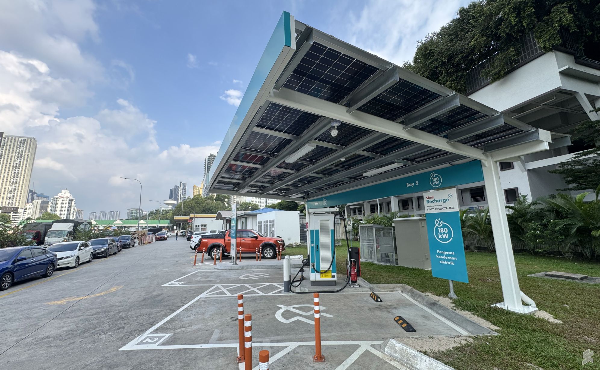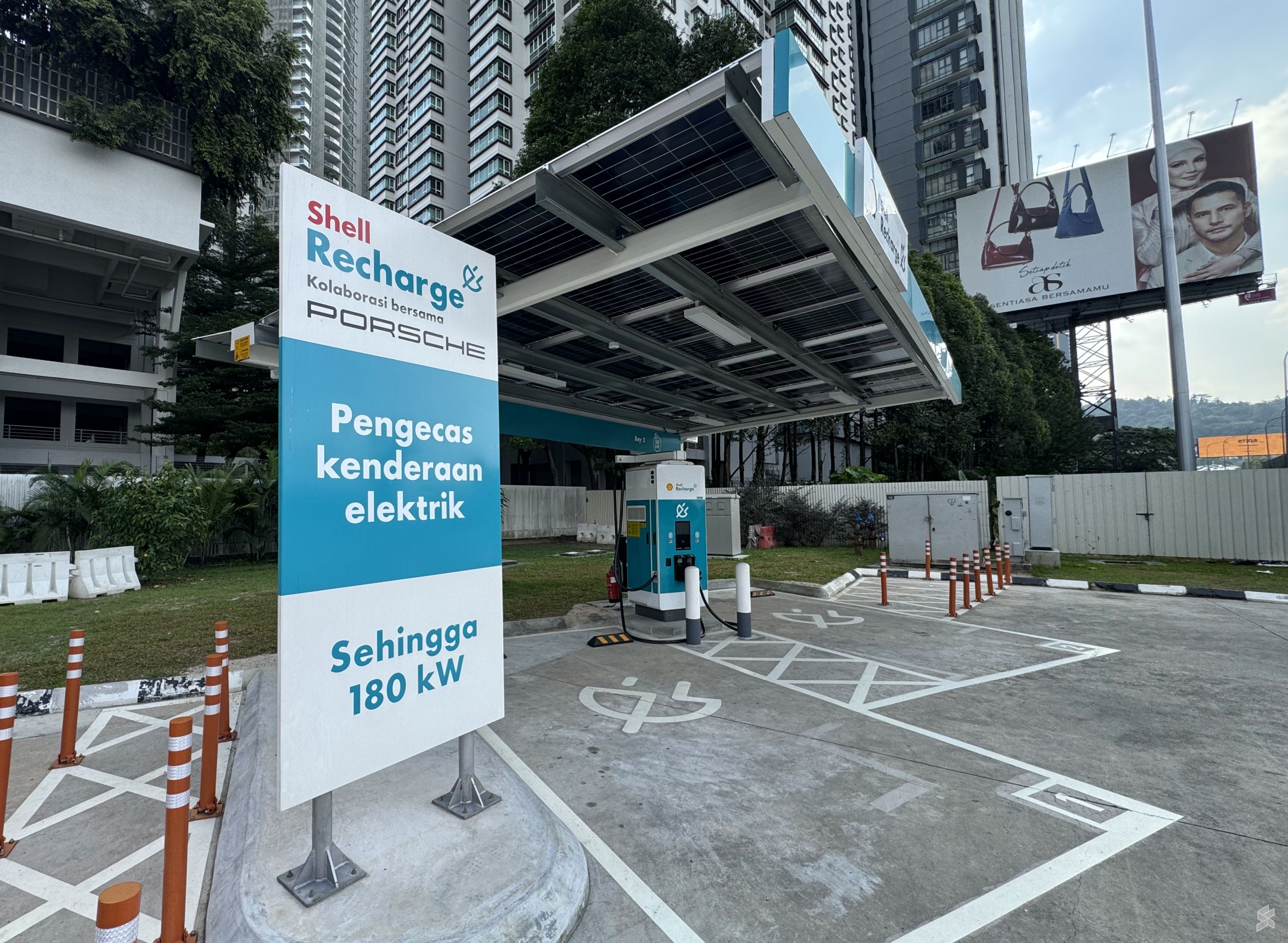 位于Duta收费站的Shell Recharge 180kW直流充电桩设有两个带顶棚的充电车位,屋顶配备太阳能电池板。你可以进入Shell油站,然后驾车前往出口即可使用充电桩。