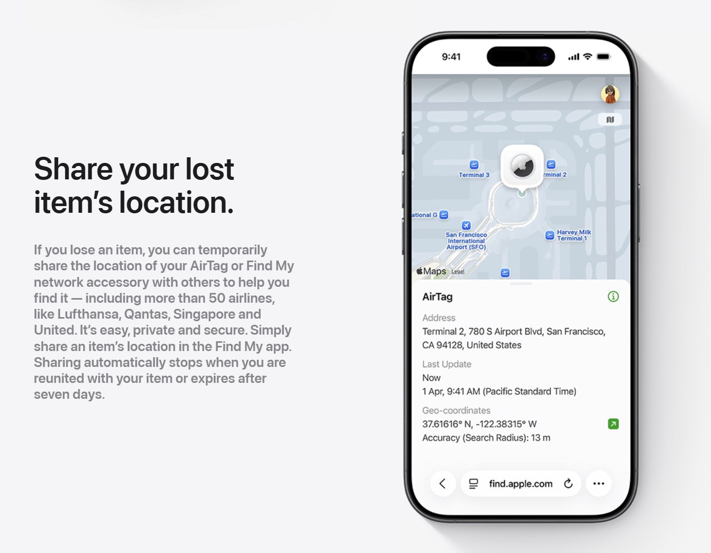 AirTag 也整合了“共享物品位置”(Share Item Location)功能,这是 iOS 的一项特性,允许用户将遗失物品的位置暂时分享给可信第三方,包括航空公司。Apple 表示,目前已有超过50家航空公司支援该功能。