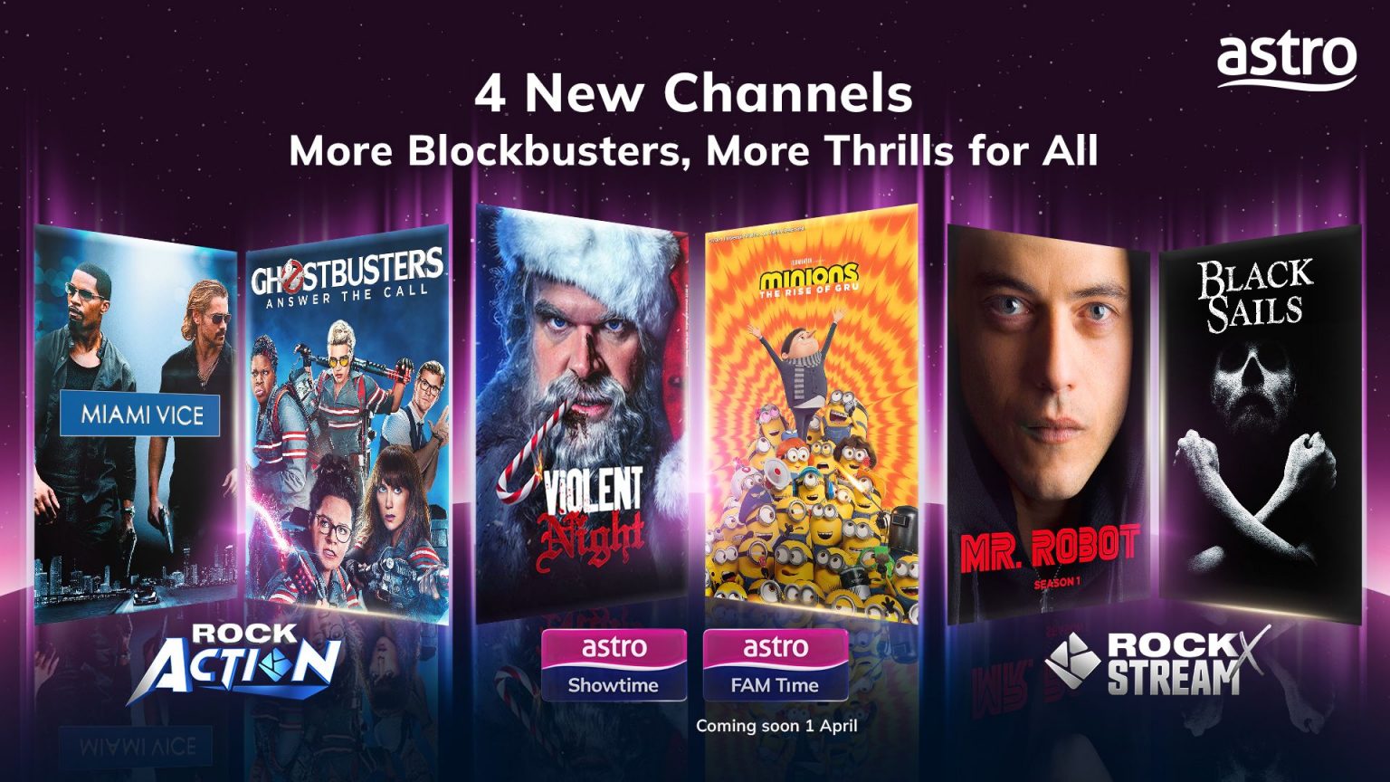 - Astro FAM Time(CH 412):自 4 月 1 日起提供适合家庭观赏的内容,如《Puss in Boots: The Last Wish》《Minions: The Rise of Gru》和《Johnny English Reborn》。
