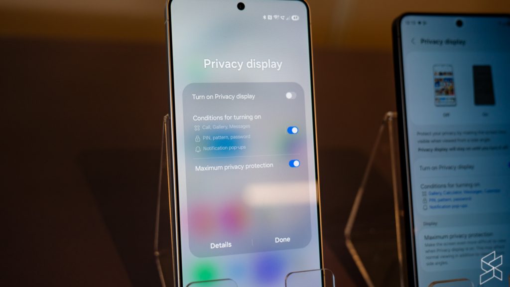 不过,Galaxy S26 Ultra带来了独家亮点——Privacy Display隐私显示功能。该功能依靠特殊AMOLED面板结合Samsung的AI技术实现,效果类似内置的隐私保护贴,但更加智能。它可限制屏幕可视角度,让旁人难以窥视你的屏幕内容。用户可选择开启或关闭该功能,甚至仅对特定应用启用。