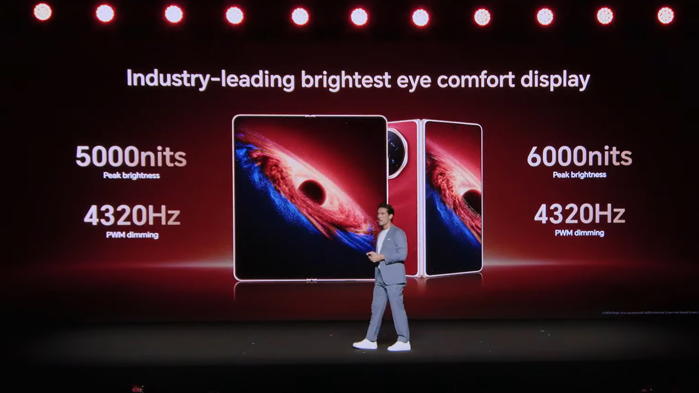 Honor Magic V6配备了一块7.95英寸、分辨率为2532×2172、刷新率为120Hz的LTPO AMOLED屏幕,峰值亮度可达6000尼特。荣耀声称,这块屏幕的折痕深度减少了44%,理论上可以使内屏看起来更加浑然一体。外屏方面,Honor Magic V6则配备了一块6.52英寸、分辨率为2420×1080、刷新率为120Hz的LTPO AMOLED面板,峰值亮度同样为6000尼特。